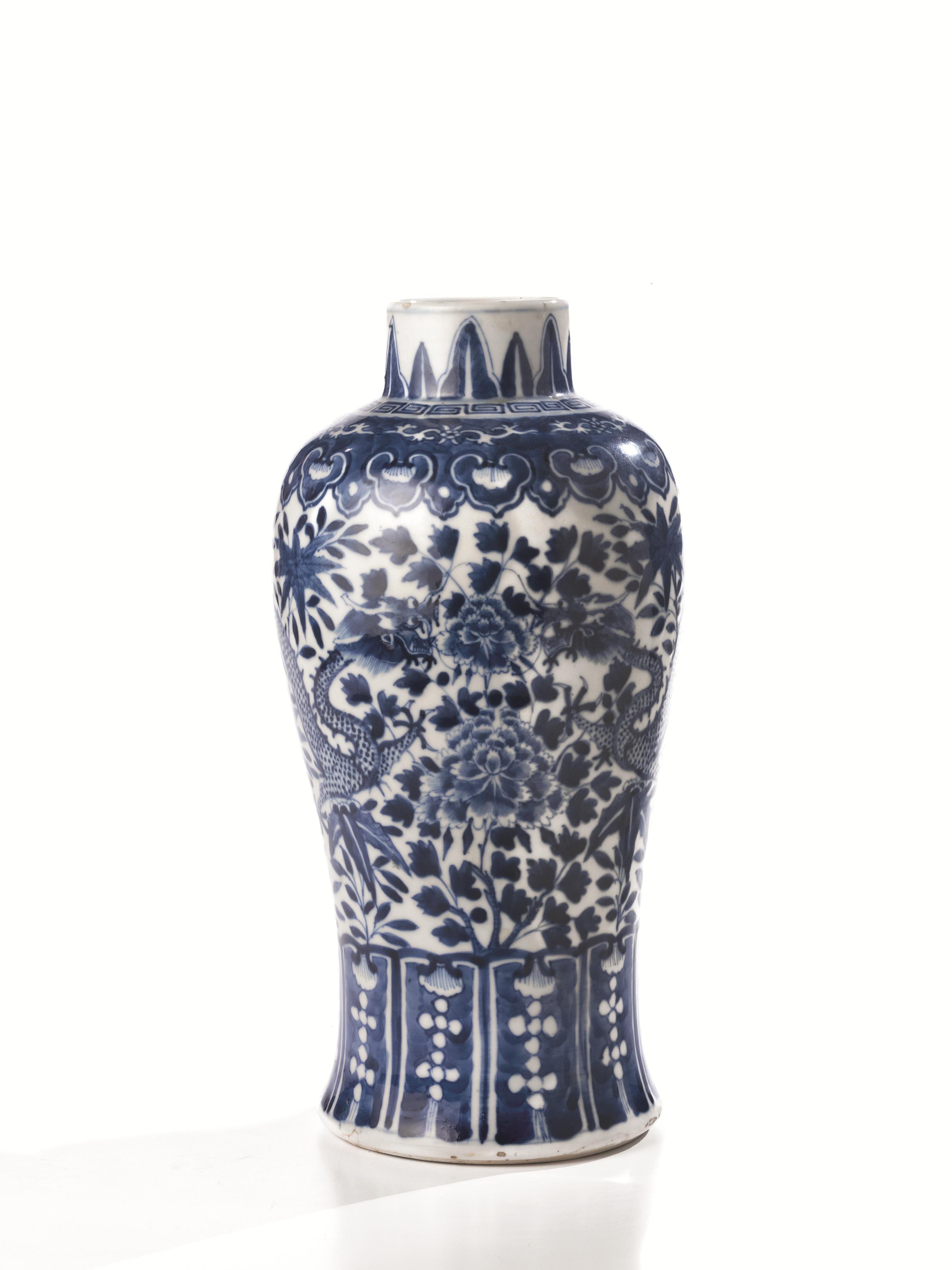 Vaso, Cina fine dinastia Qing, in porcellana bianca e blu, decorato con figure di draghi su fondo floreale e motivi Ruyi, marchio apocrifo Kangxi, alt. cm 32