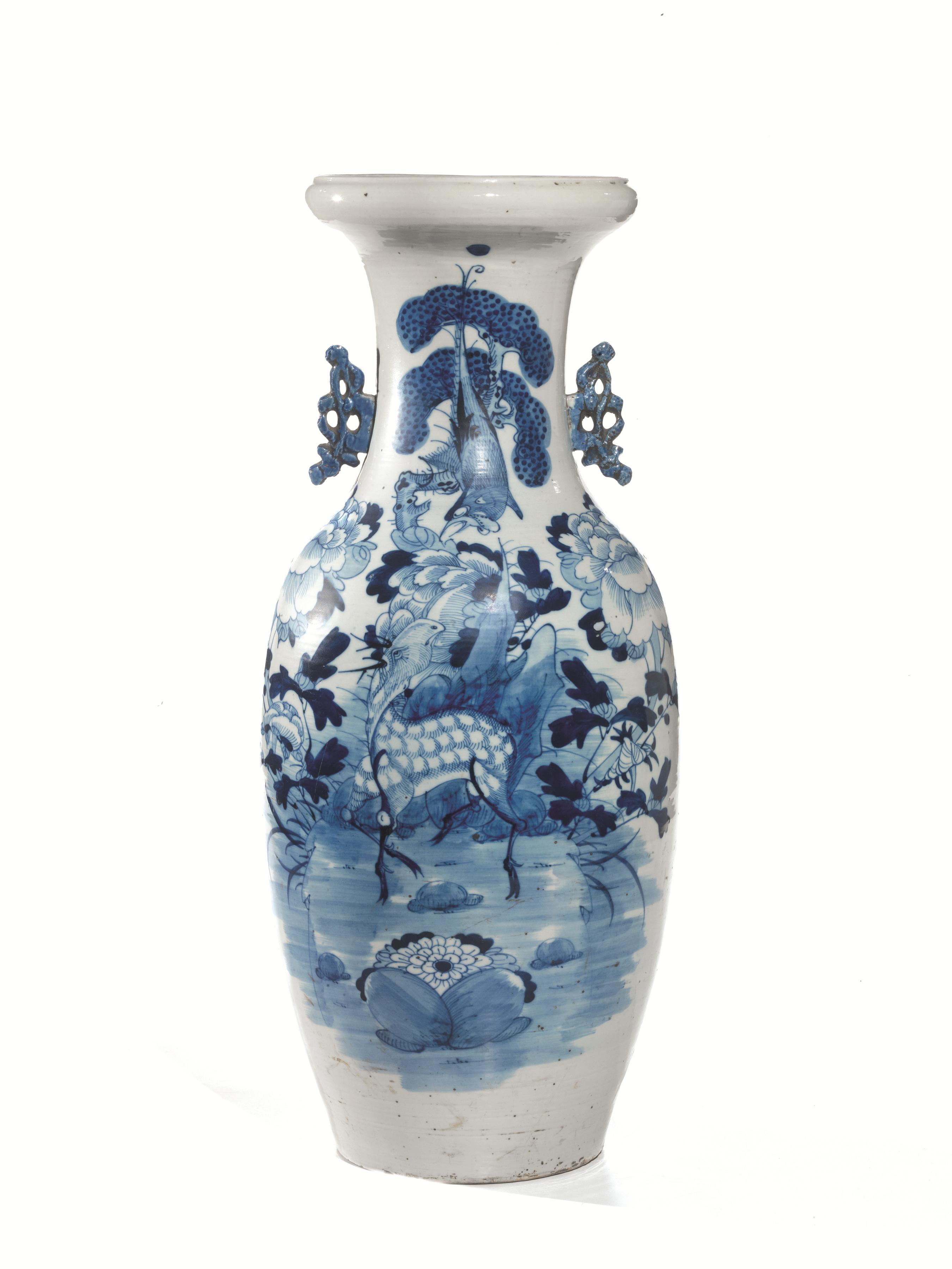 Vaso, Cina fine dinastia Qing, in porcellana bianca e blu, decorato con figura di cerbiatto, anse traforate, alt. cm 58