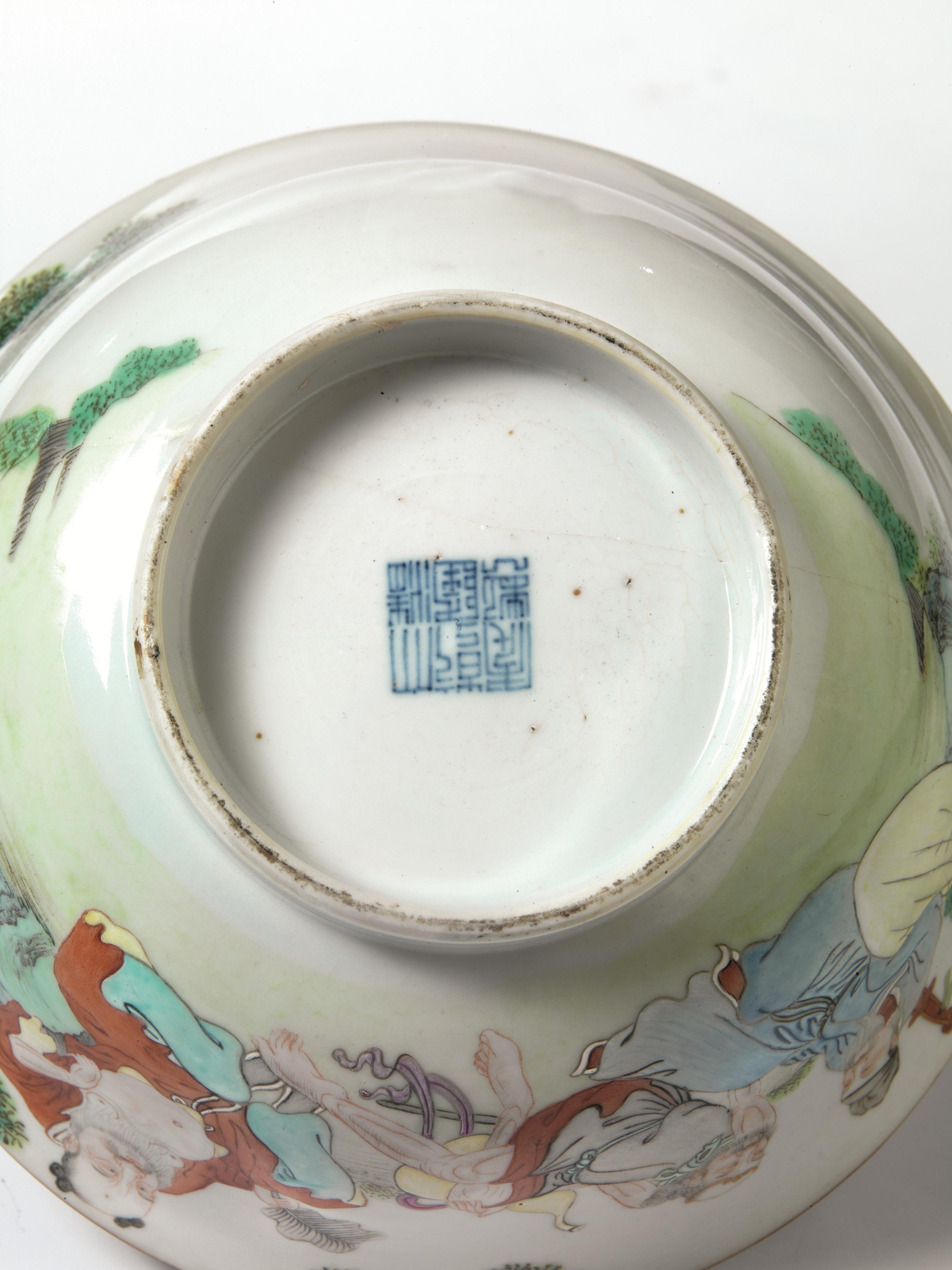 Ciotola Cina dinastia Qing, sec. XVIII, in porcellana finemente decorata con figure di saggi, reca marchio Qianlong (1736-1795), diam. cm 19,2, restauri