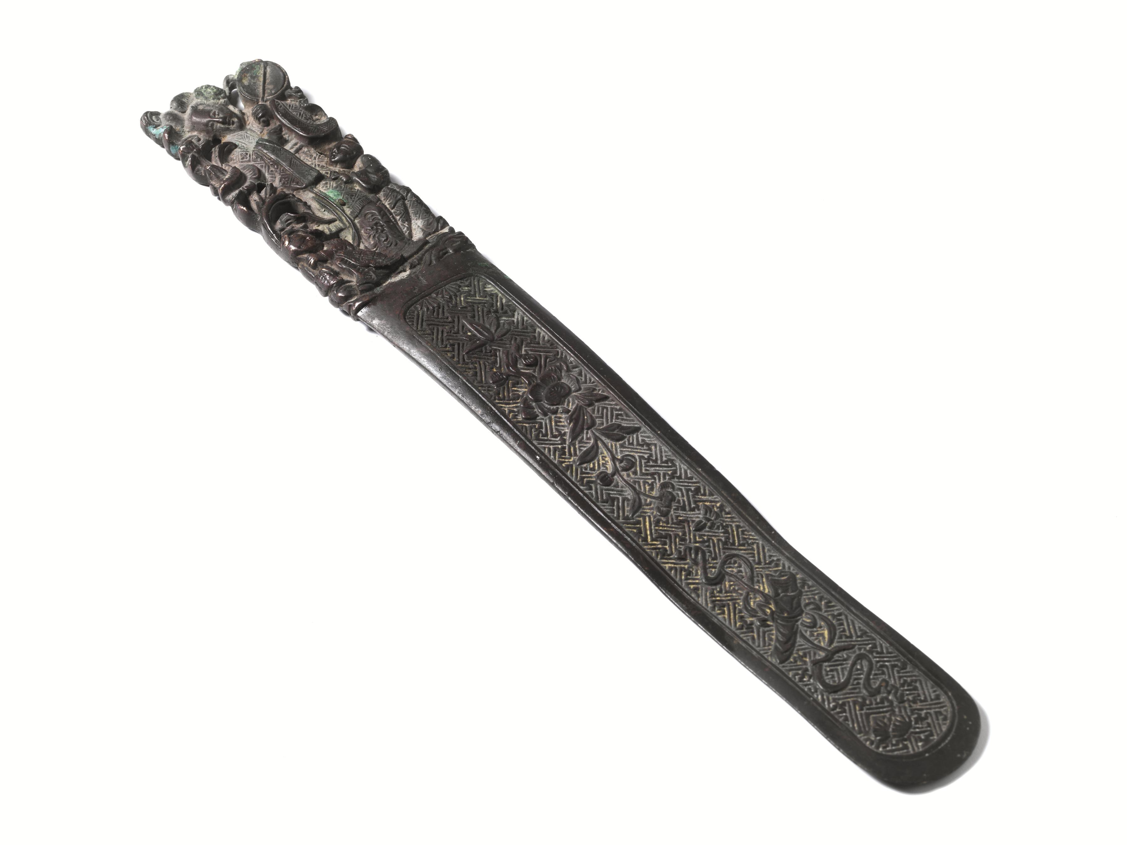 Fermacarte, Cina fine dinastia Qing (1644-1911), in bronzo cesellato con rami fioriti e il manico con figura femminile e bambini, lung. cm ….