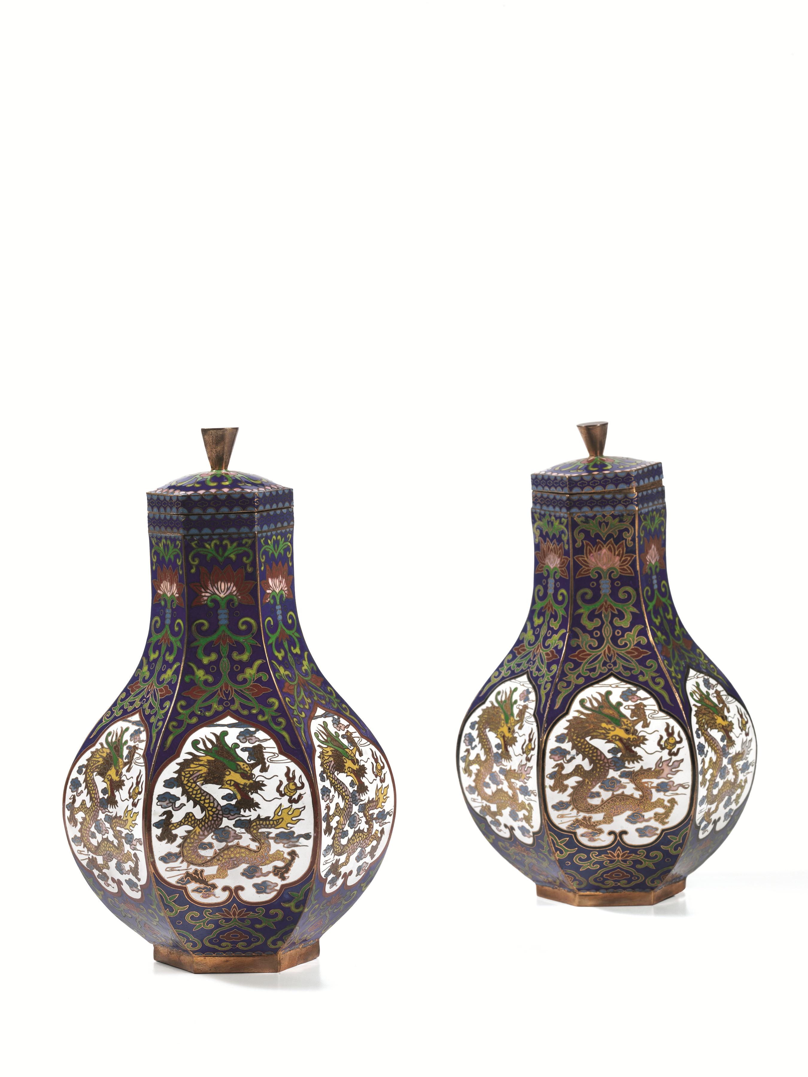 Lot 281 | Coppia di vasi, Cina sec. XX, di forma esagonale, in samalto cloisonné,...