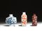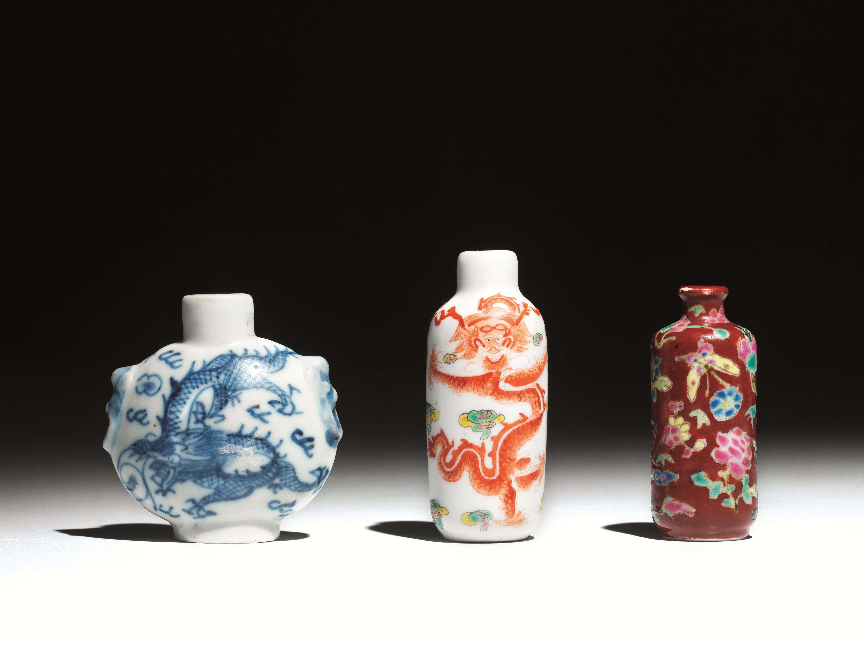 Tre snuff-bottles, Cina sec. XIX-XX, in porcellana, una a fondo bianco, decorata con dragoni rossi, una a fondo rosso decorata a fiori e farfalle, una bianca e blu con decoro a draghi, alt. cm 7,4; cm 6,4; cm 6,5 (3)