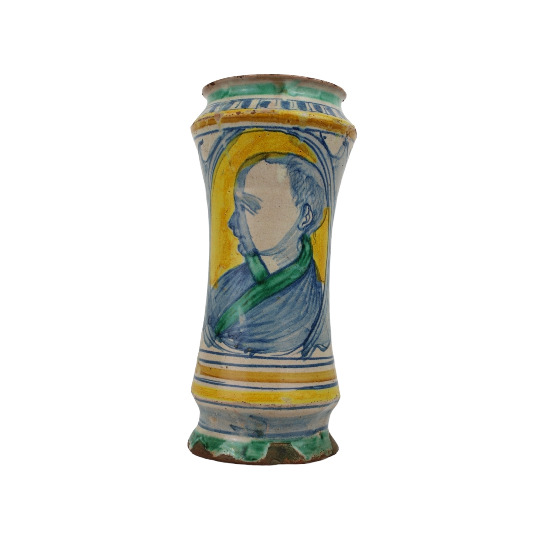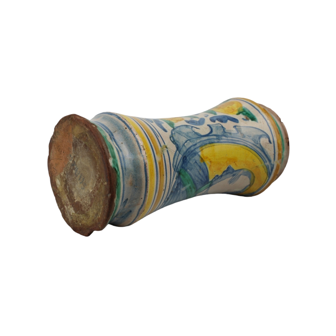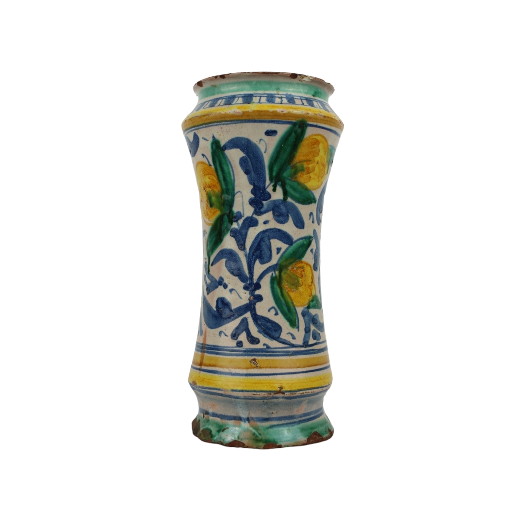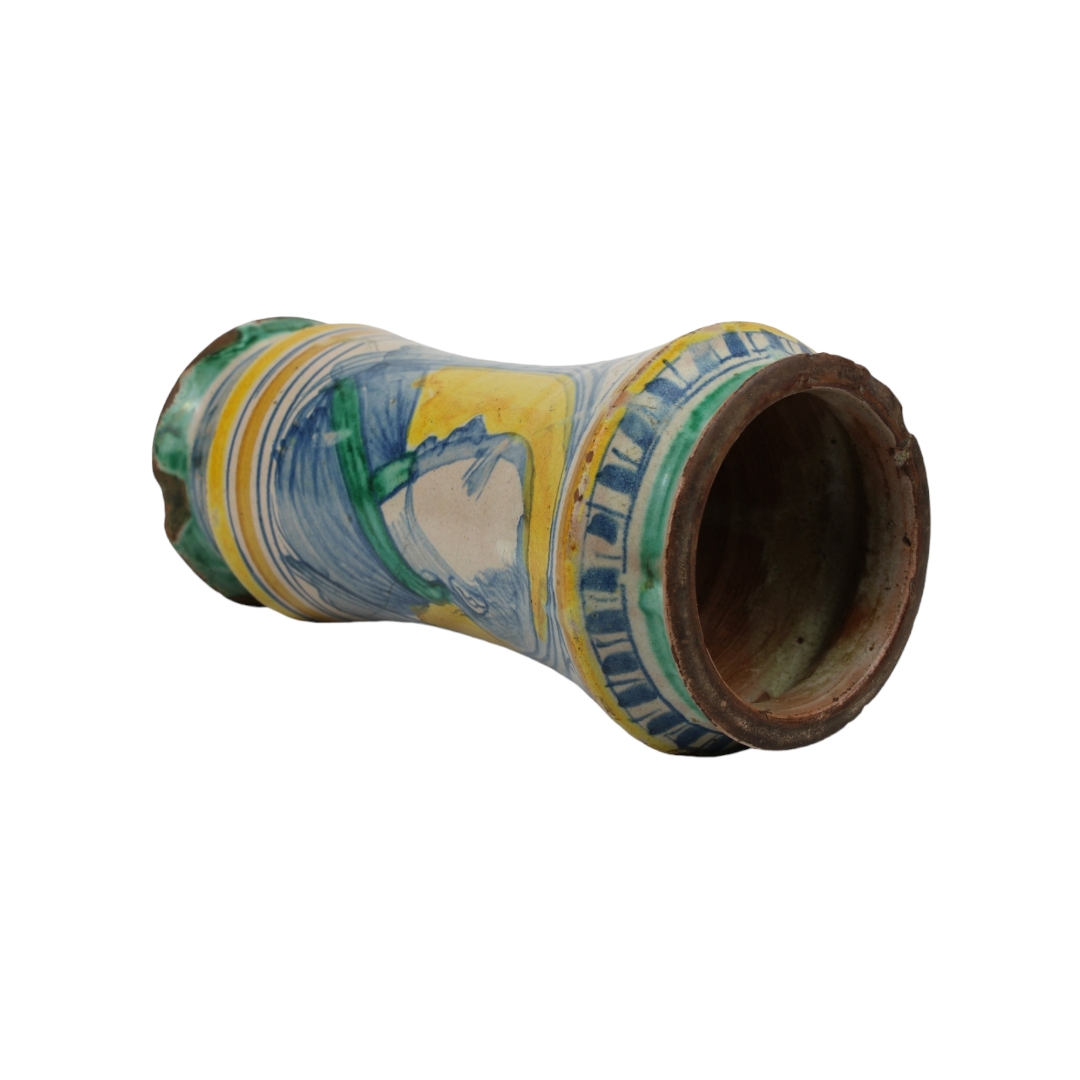 ALBARELLO in maiolica policroma dentro riserva figura maschile e decoro con frutta , filet e usure del tempo Sciacca XVII secolo h cm 25 x 12