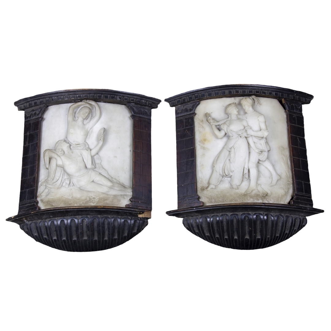 COPPIA DI IMPORTANTI PLACCHE in marmo statuario scolpite mirabilmente a bassorilievo Raff Episodi cavallereschi dei paladini supportate da elementi in legno intagliati periodo transitorio 1780/1810 Italia h cm 26 x 23