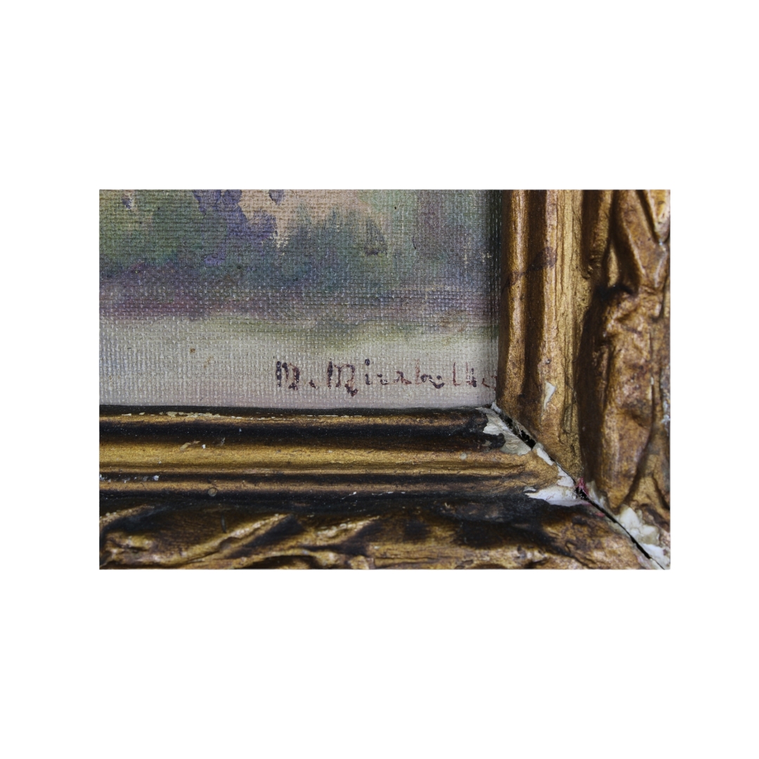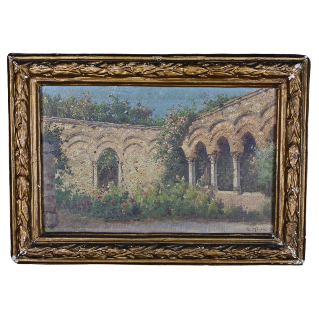 OLIO SU TELA Raff Cortile colonnato firmato in basso a d/x Mario Mirabella Palermo 1870/1931 h cm 30 x 47 /cornice h cm 41 x 58