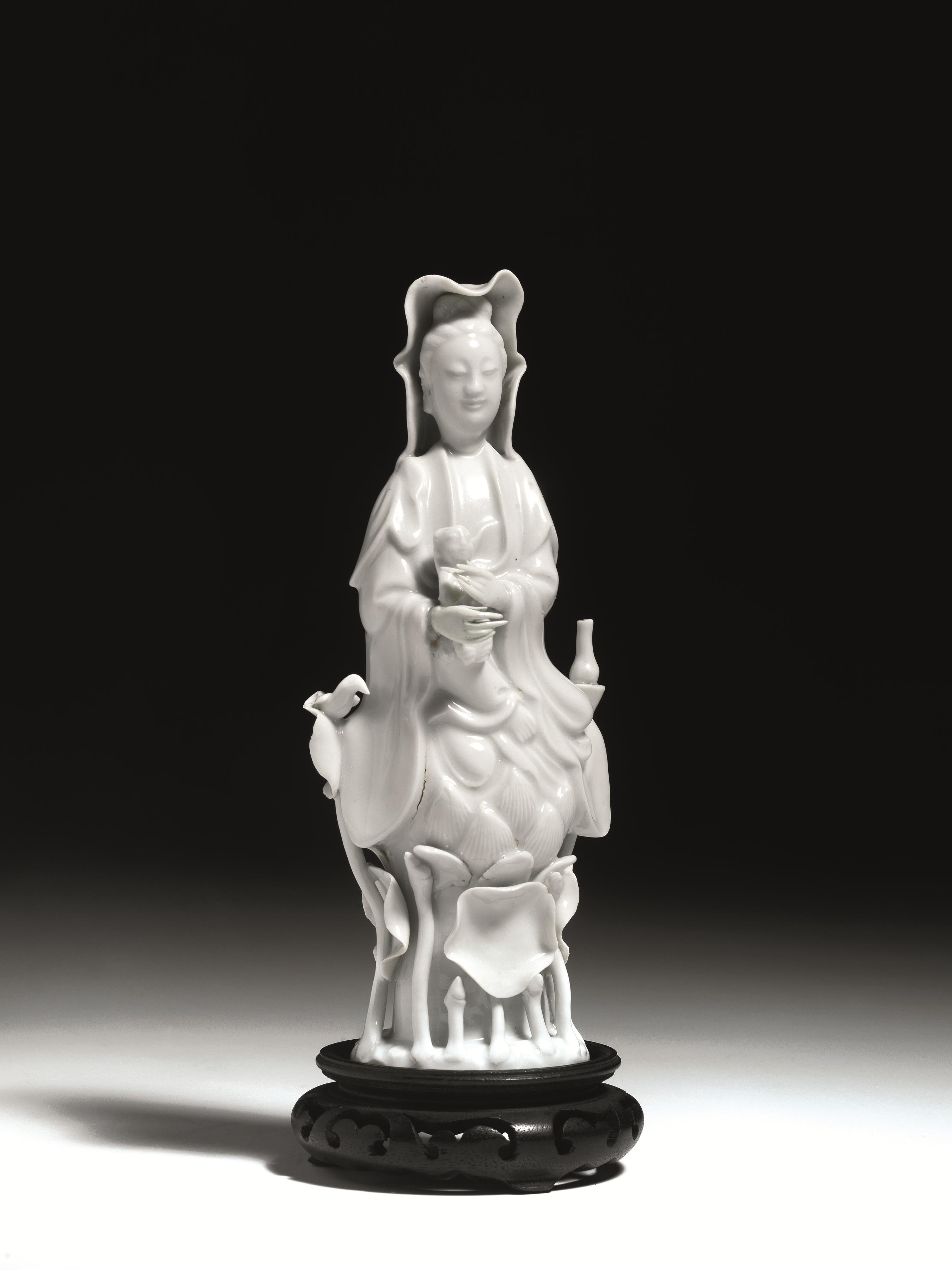 Guanyin, Cina inizi sec. XX, in porcellana blanc de Chine, stante su base a...