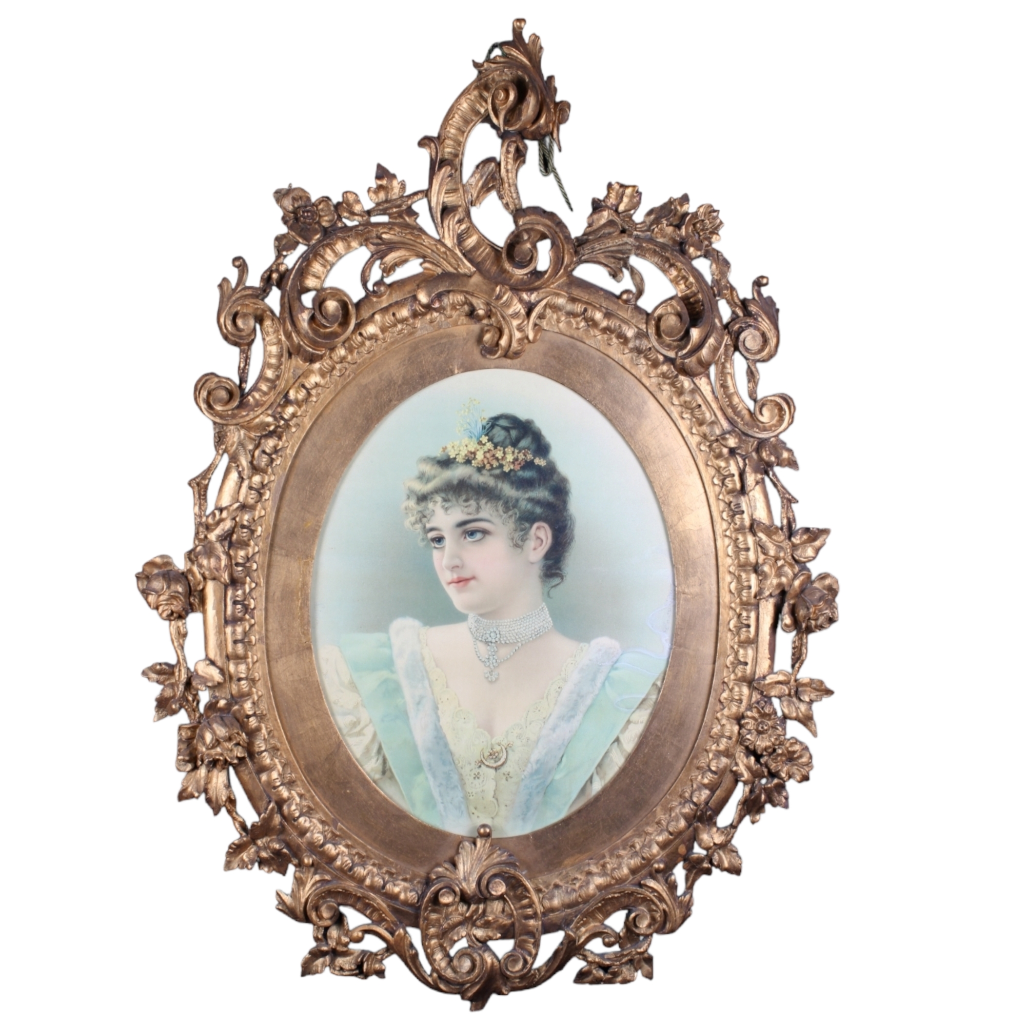 CORNICE IN LEGNO riccamente intagliata a motivi floreali e dorata contenente stampa colorata Raff Nobildonna Inghilterra XIX secolo h cm 46 x 36 / cornice 98 x 69