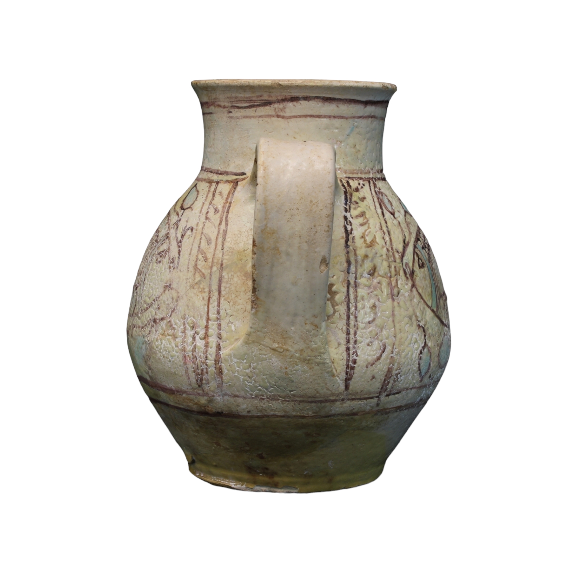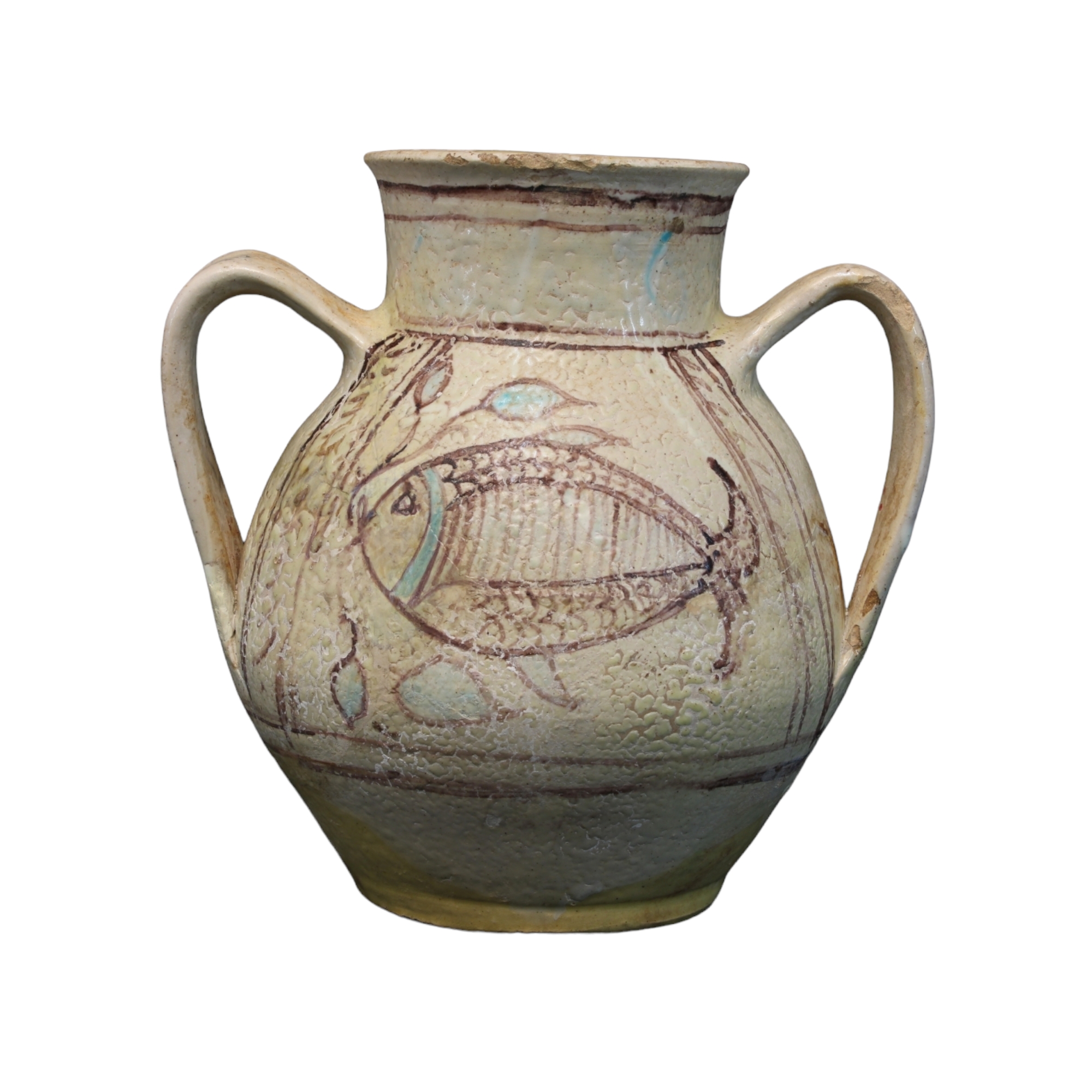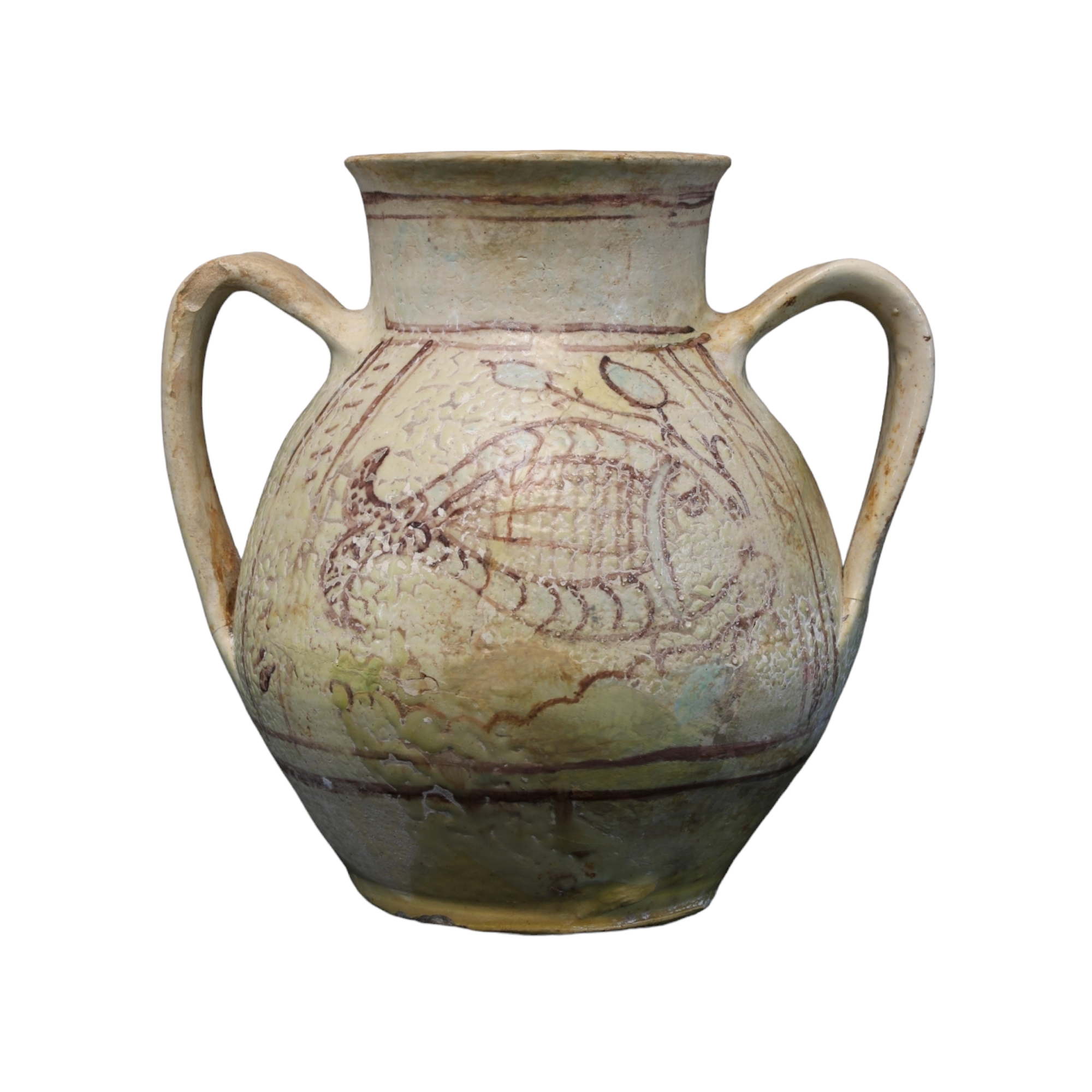 VASO in ceramica manganese e verde rame decorato con pesci Italia XV secolo h cm 18 x 18 x 15
