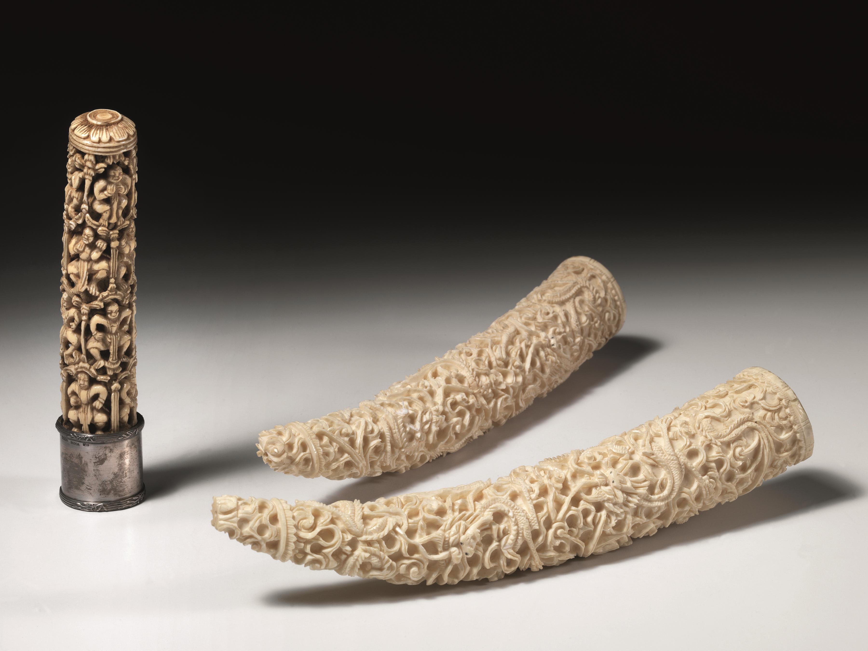 Manico, India sec. XIX, in avorio, finemente scolpito con una moltitudine di