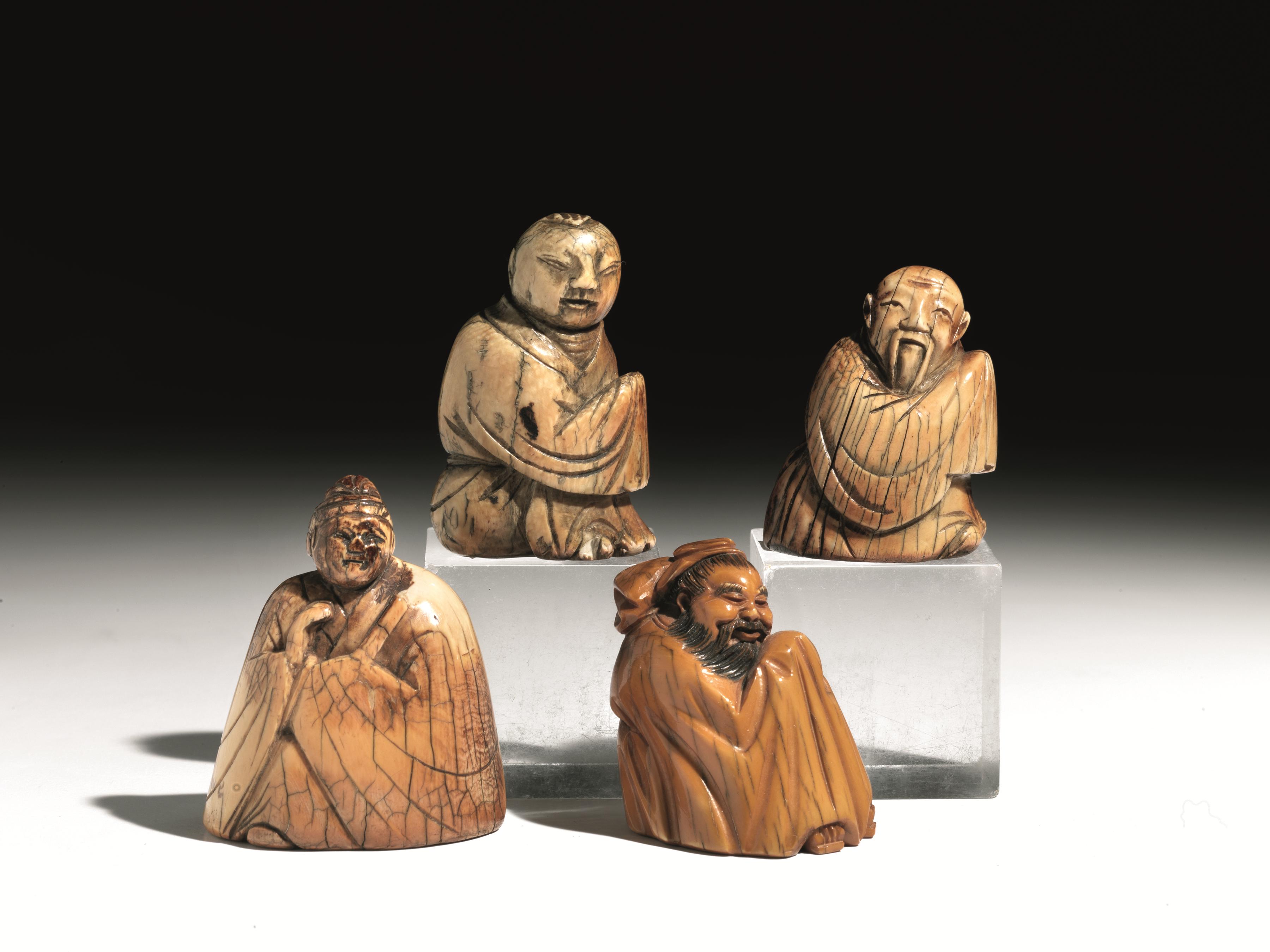 Tre Okimono, Giappone sec. XIX, in avorio, raffiguranti saggi, alt. cm 5,8; alt. cm 5 (3)