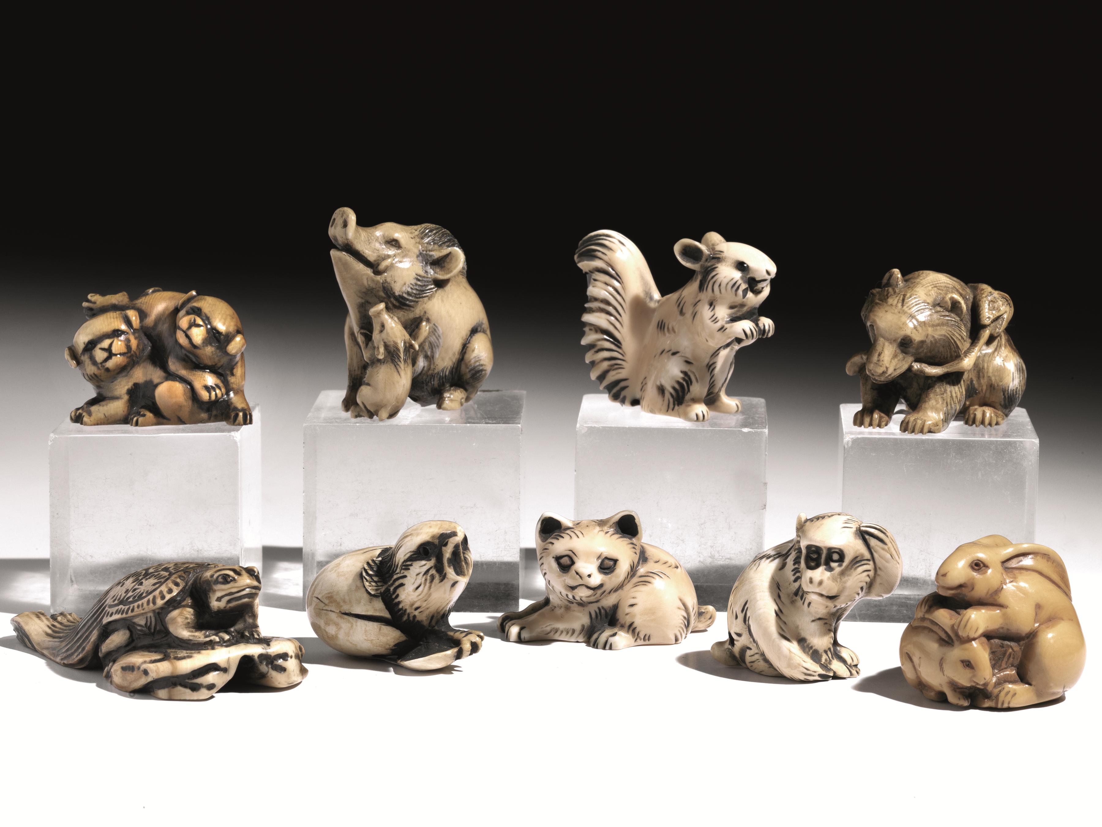 Nove Netsuke, Giappone periodo Meiji, in avorio e osso, tutti intagliati in forma di animali, misure diverse (9)