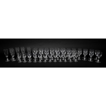 Servizio di bicchieri in cristallo composto da 12 bicchieri per acqua, 12 bicchieri per vino, 12 bicchieri da liquore ed 9 flutes (un bicchiere vino sbeccato).