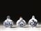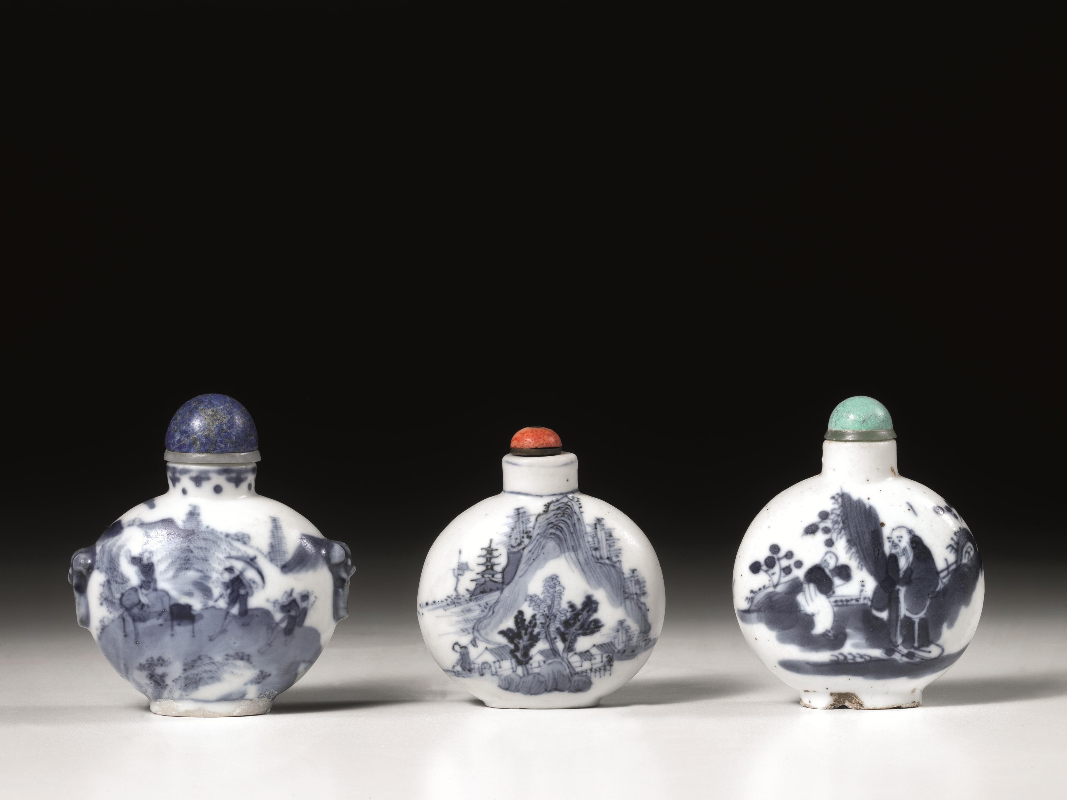 Tre snuff bottles, Cina, periodo repubblicano, in porcellana bianca e blu