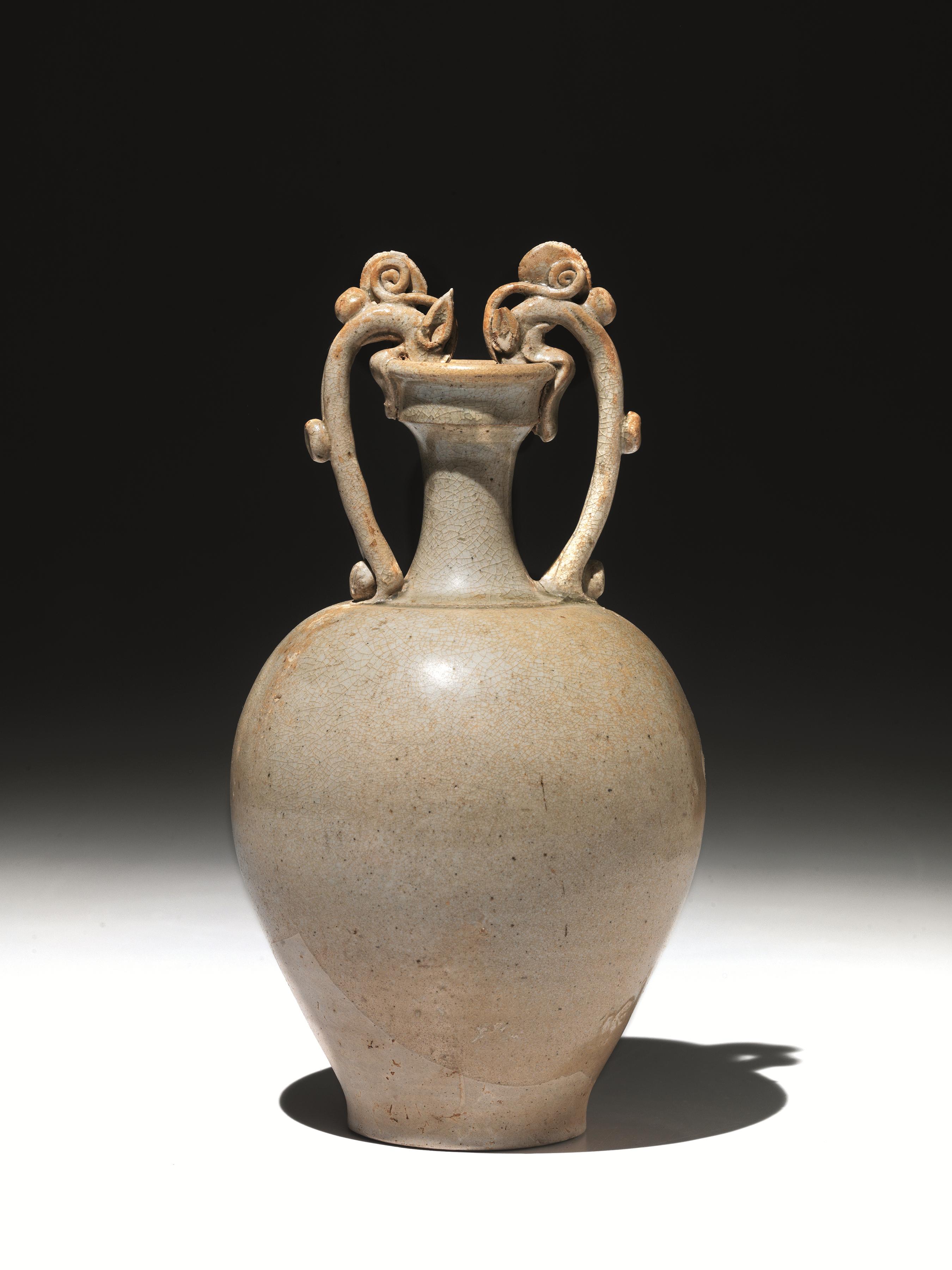 Vaso biansato periodo Tang, 618-907, in terracotta invetriata, i manici a forma di