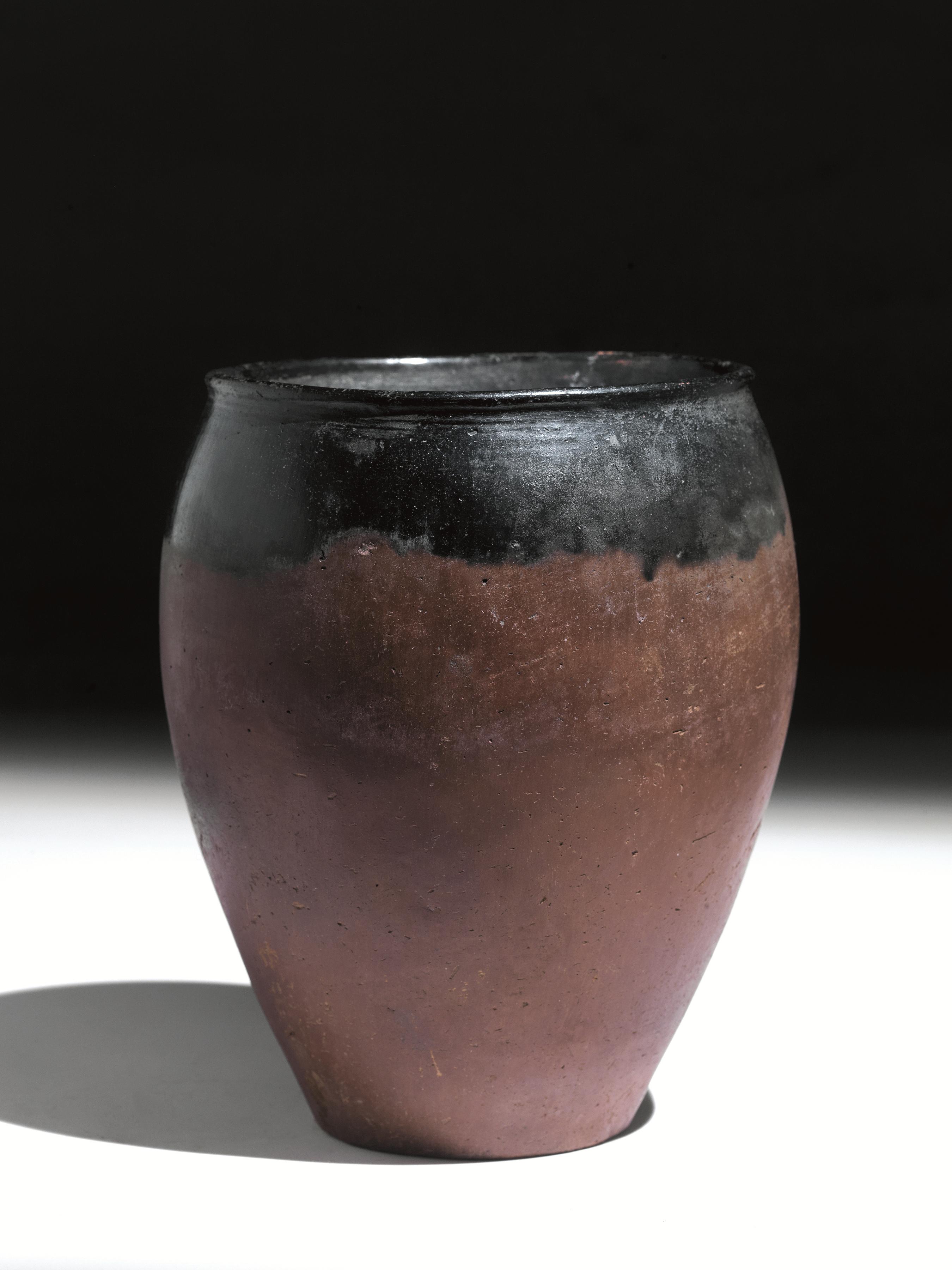 Olla a bocca brunita con orlo appena estroflesso e arrotondato, corpo ovoide, fondo piatto