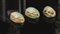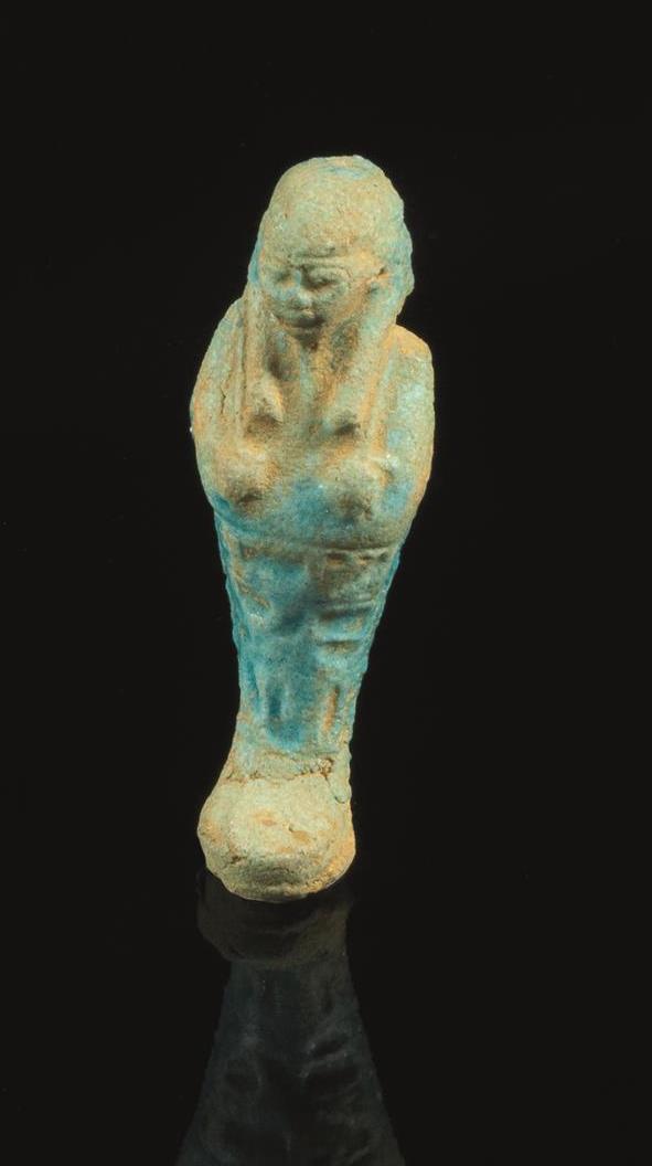 Tre scarabei: dorso) la testa vagamente rettangolare è in rilievo sulla superficie del clipeo a raggiera dentellato anteriormente. Il protorace è separato dalla testa e dalle elitre mediante incisioni. Le zampe sono rese in maniera stilizzata; profilo) zampe disegnate mediante incisioni sottili e poggianti sulla base; uno dei tre è intagliato a tutto tondo La parte inferiore è iscritta con geroglifici ed un ushabti maschile accuratamente realizzato pur nelle piccole dimensioni (4)