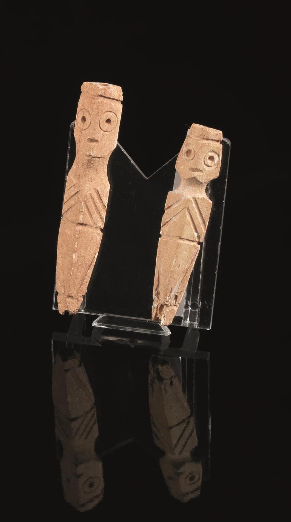 Due statuette raffiguranti idoli in forma stilizzata con grandi occhi