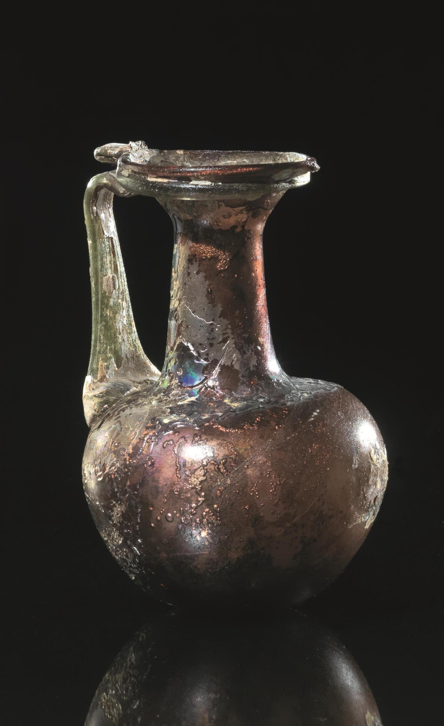 Stato di conservazione: lieve foro sul ventre; iridescenza argentea sull’ansa, la bocca e parte del collo