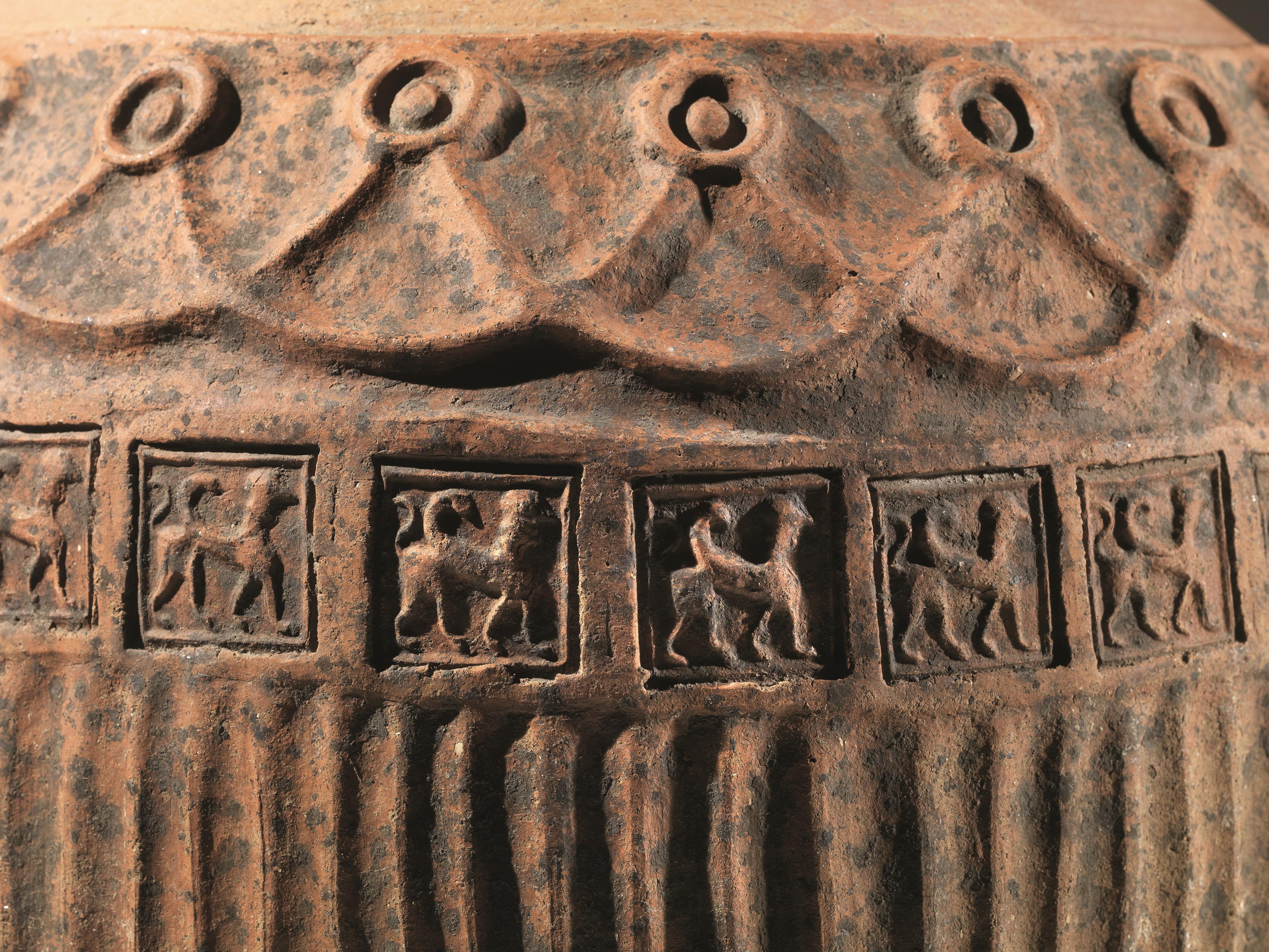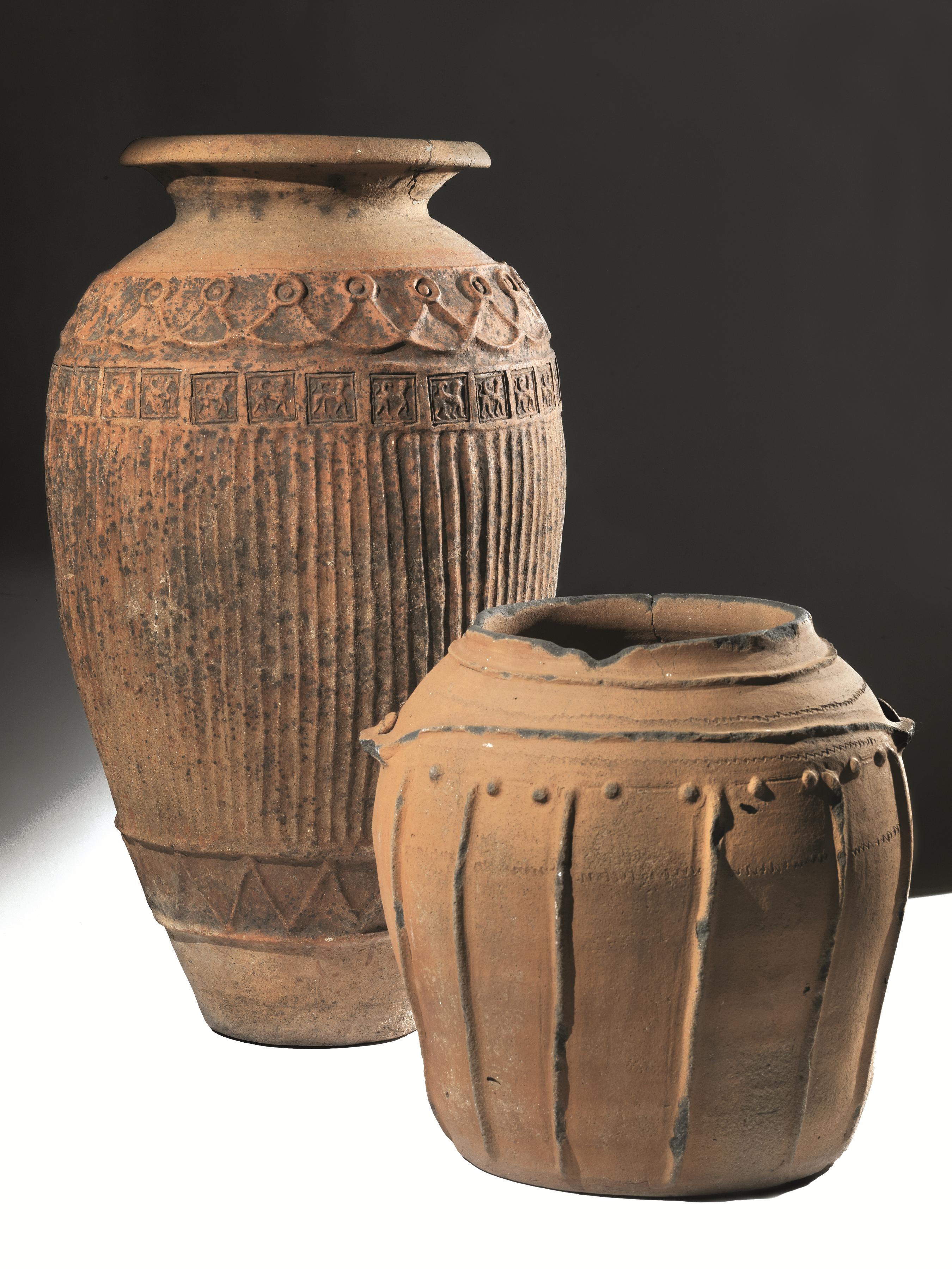 Materia e tecnica: impasto nerastro ricco di inclusi micacei, ingubbiatura camoscio, modellato a tornio lento, decorazione eseguita a rilievo
