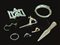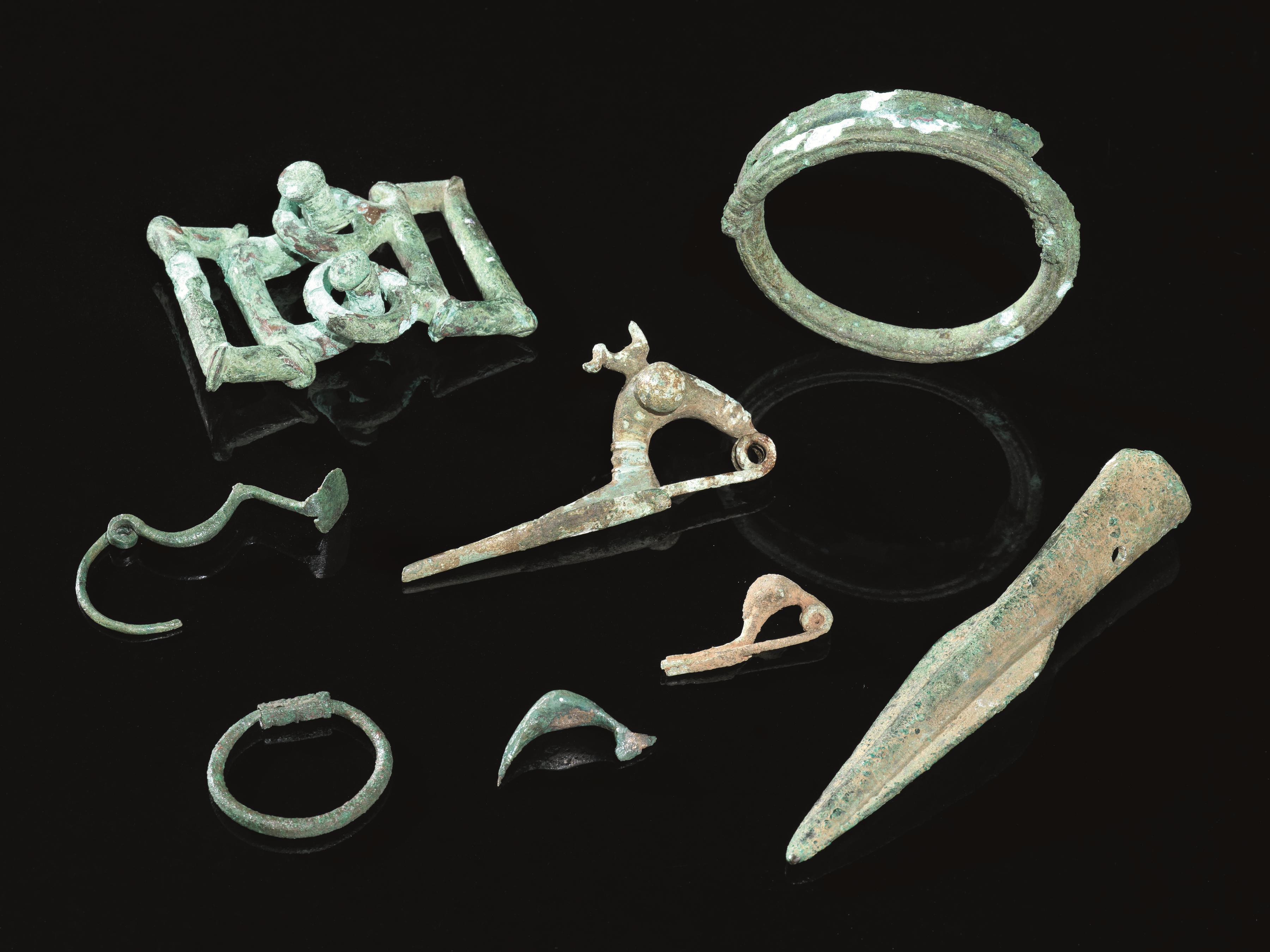 Una fibula a sanguisuga, integra, con molla a due giri, staffa lunga e arco romboidale; una fibula frammentaria ad arco serpeggiante, staffa a disco; un arco di fibula a sanguisuga; una maniglia, integra, in filo di bronzo pertinente probabilmente a un bacile (4)