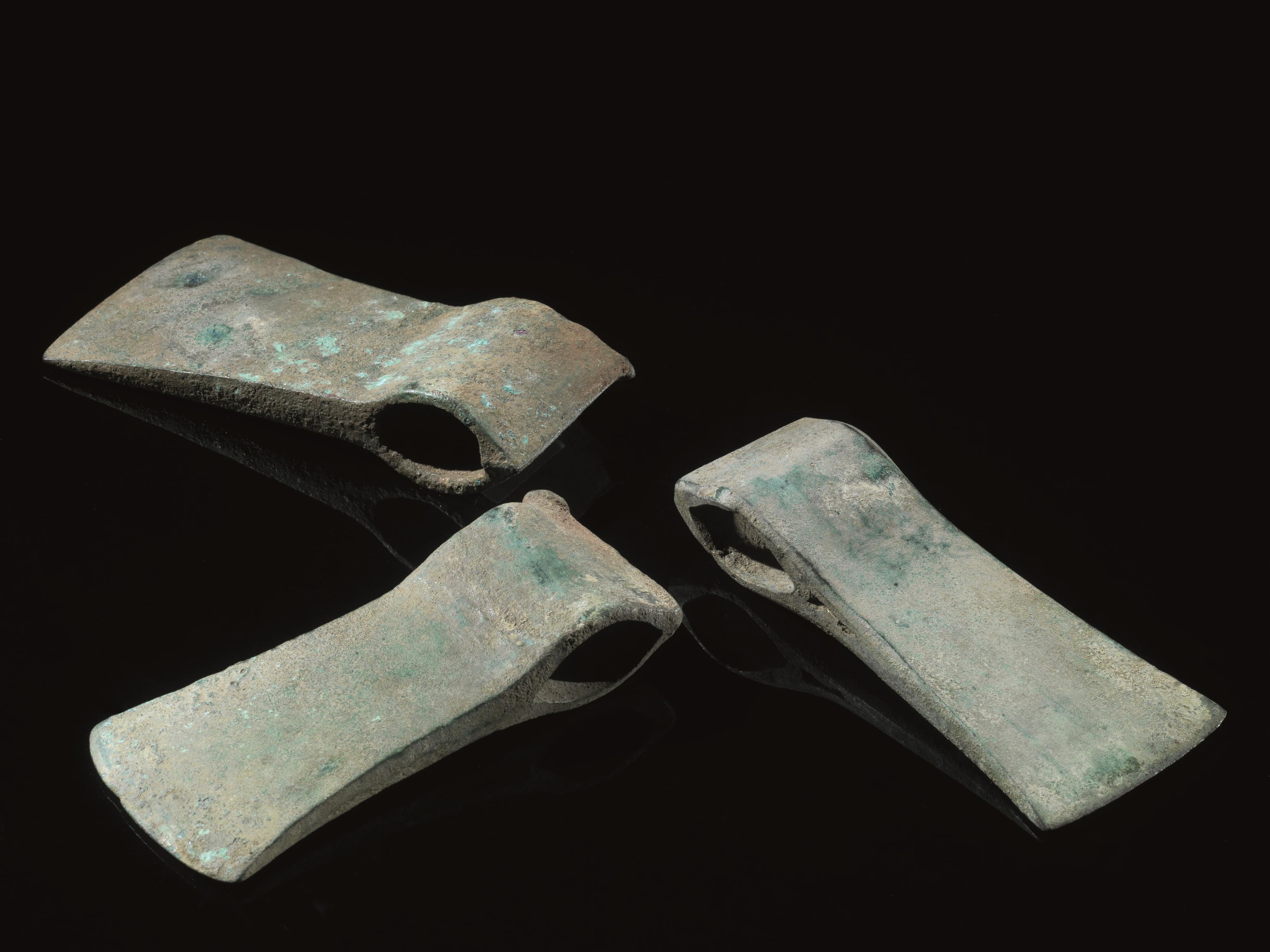 Tre asce ad occhio in bronzoMateria e tecnica: bronzo fuso e martellatoTre...