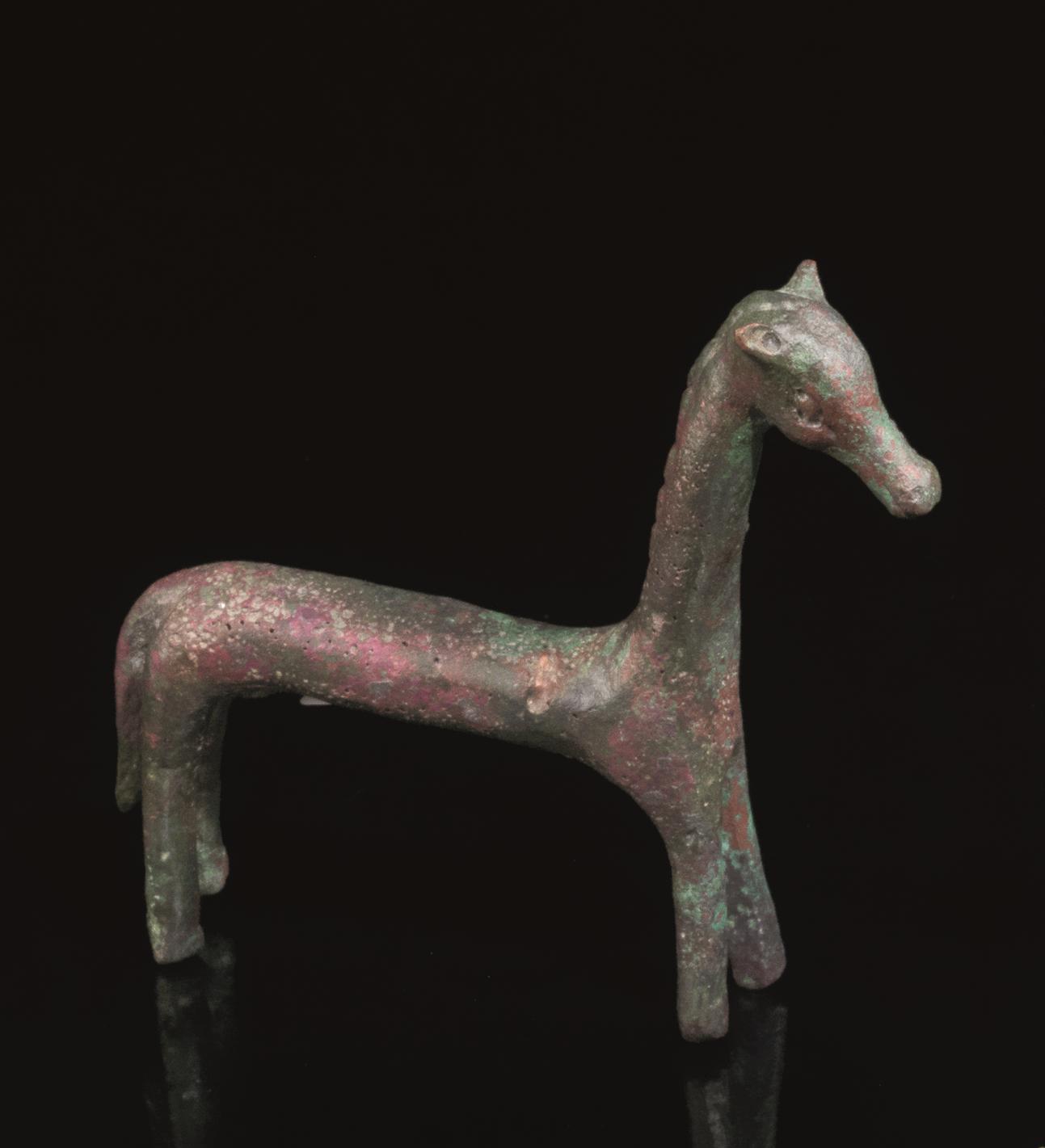 Figura stilizzata di cavallo stante con corpo allungato, testa eretta e criniera accennata da un solo lato
