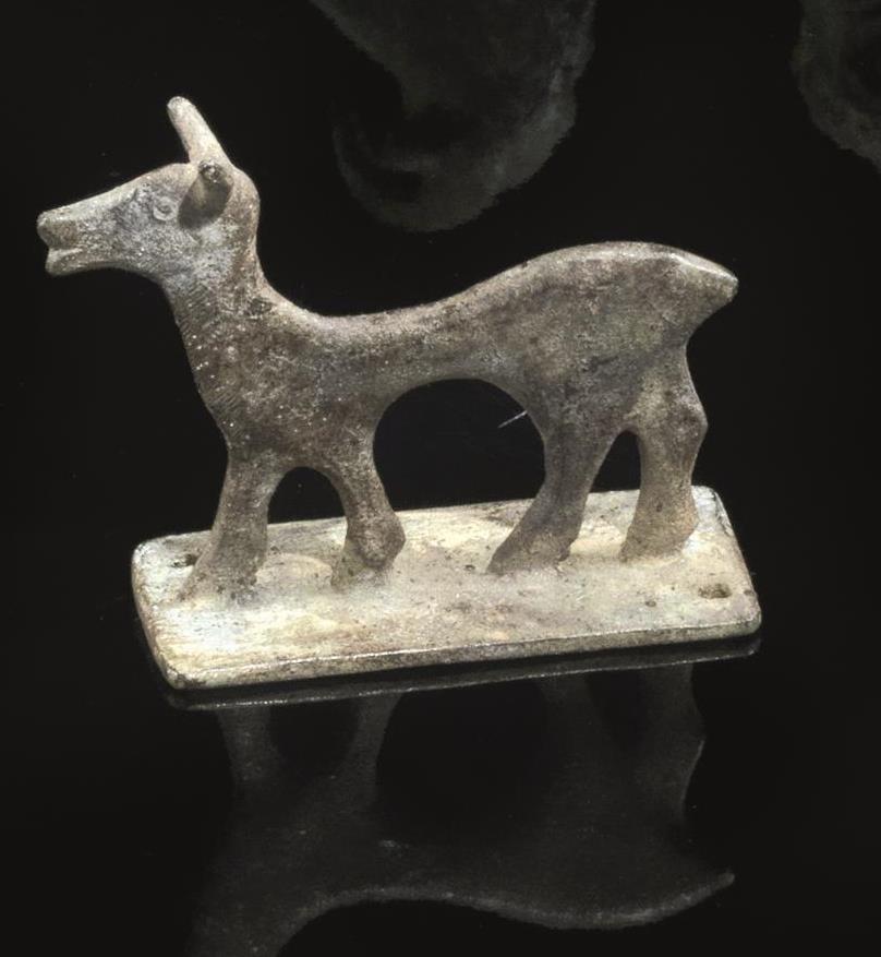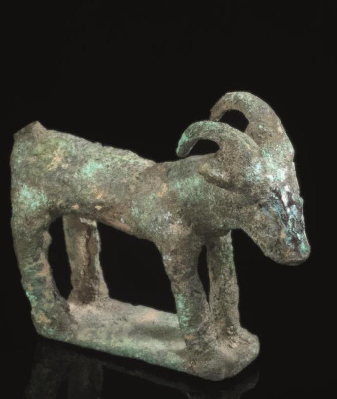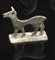 Statuetta modellata a capride stilizzato in posizione eretta su base rettangolare con corna arcuate rivolte all’indietro, e altra raffigurante bovide gradiente su base rettangolare fortemente stilizzata (2)