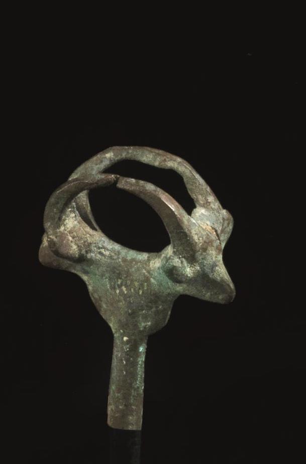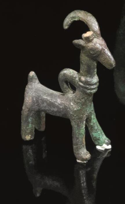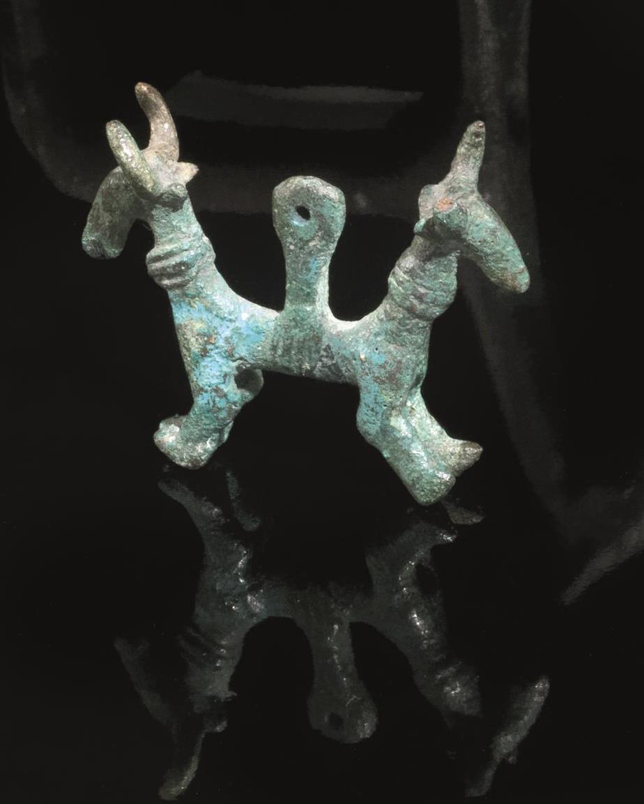 Terminale configurato a protomi contrapposte di hybex stilizzate e riunite per le corna, un pendente modellato a stambecco con la testa e la coda erette, e le corna arcuate, e anello di sospensione sulla schiena e altro pendente a doppia protome di capridi raffigurati nella sola parte anteriore con anello di sospensione al centro (3)
