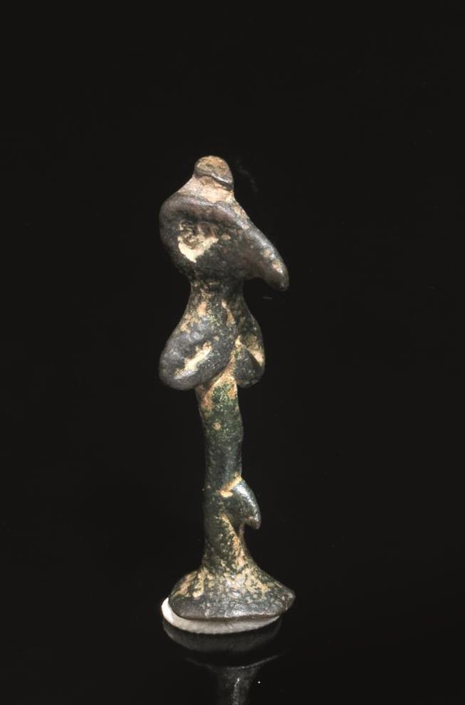 Statuetta a pilastro raffigurante divinità maschile con becco d’uccello, braccia ripiegate sul petto, sesso in evidenza, base circolare e gallo in posizione stante coda e testa erette, tenone quadrangolare per l’inserimento nella base (2)