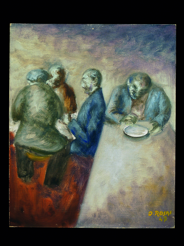 La pittura in quell’anno, 1947, è largamente sussultata come da un intimo travaglio:la materia si sfalda nelle luci e acquisisce complessità di stesura, si accumula in toni scuri e contrasta con i chiari tanto da rendere mobile il ritmo complessivo delle immagini. L’osservazione degli interni, carattere e preferenza di Rosai, ha in questo dipinto una singolare impaginazione; il disegno geometrico, che si direbbe cubista, del tavolo allunga e rende dinamica la proporzione dello spazio: siamo nell’ambito breve di una trattoria e pure lo slancio del piano amplifica l’ambiente, dà accesso a una rinnovata collocazione delle figure e apre a una diversa intimità, più eccentrica, della loro presenza. L. C.