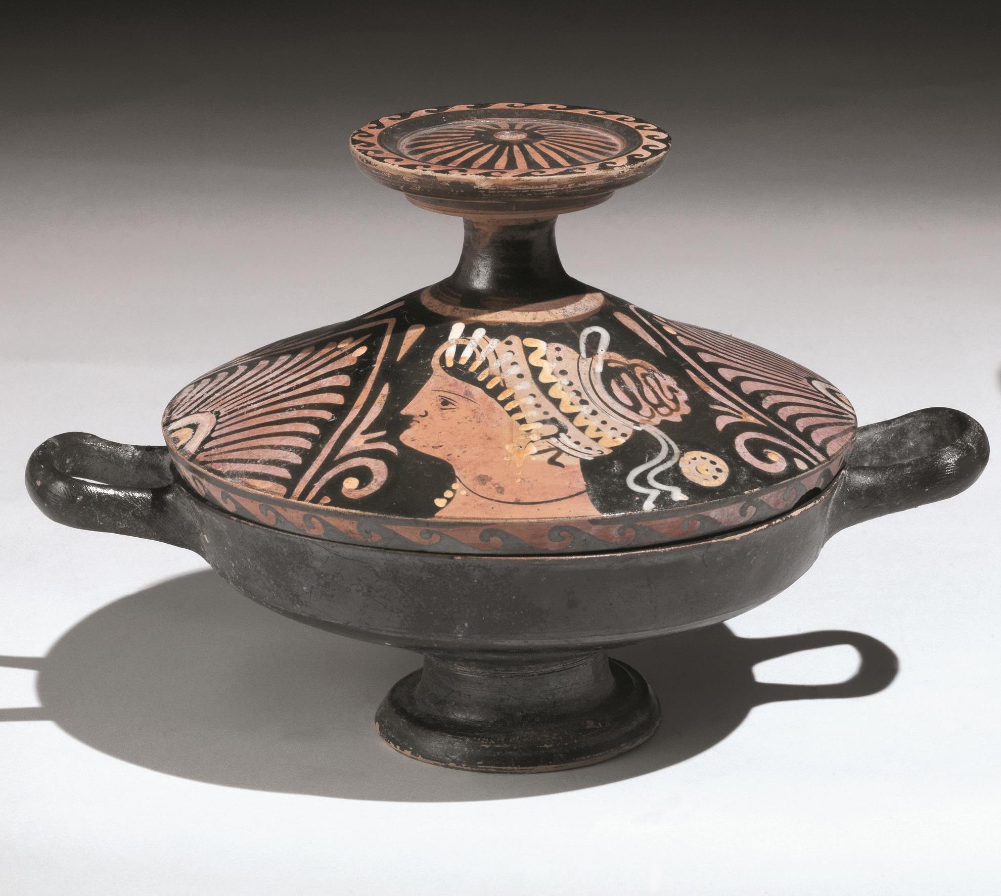 Decorazione: coperchio) sulla faccia superiore del pomello meandro a onda destrorso e tratti radiali; coppa) sulla spalla due palmette a ventaglio contrapposte con girali, alternate ad un busto femminile di profilo a destra con i capelli avvolti nel kekryphalos ricamato; la donna porta la sthepane radiata, orecchini pendenti e collana di perle; nel campo rosette, orlo decorato con meandro ad onda sinistrorso;