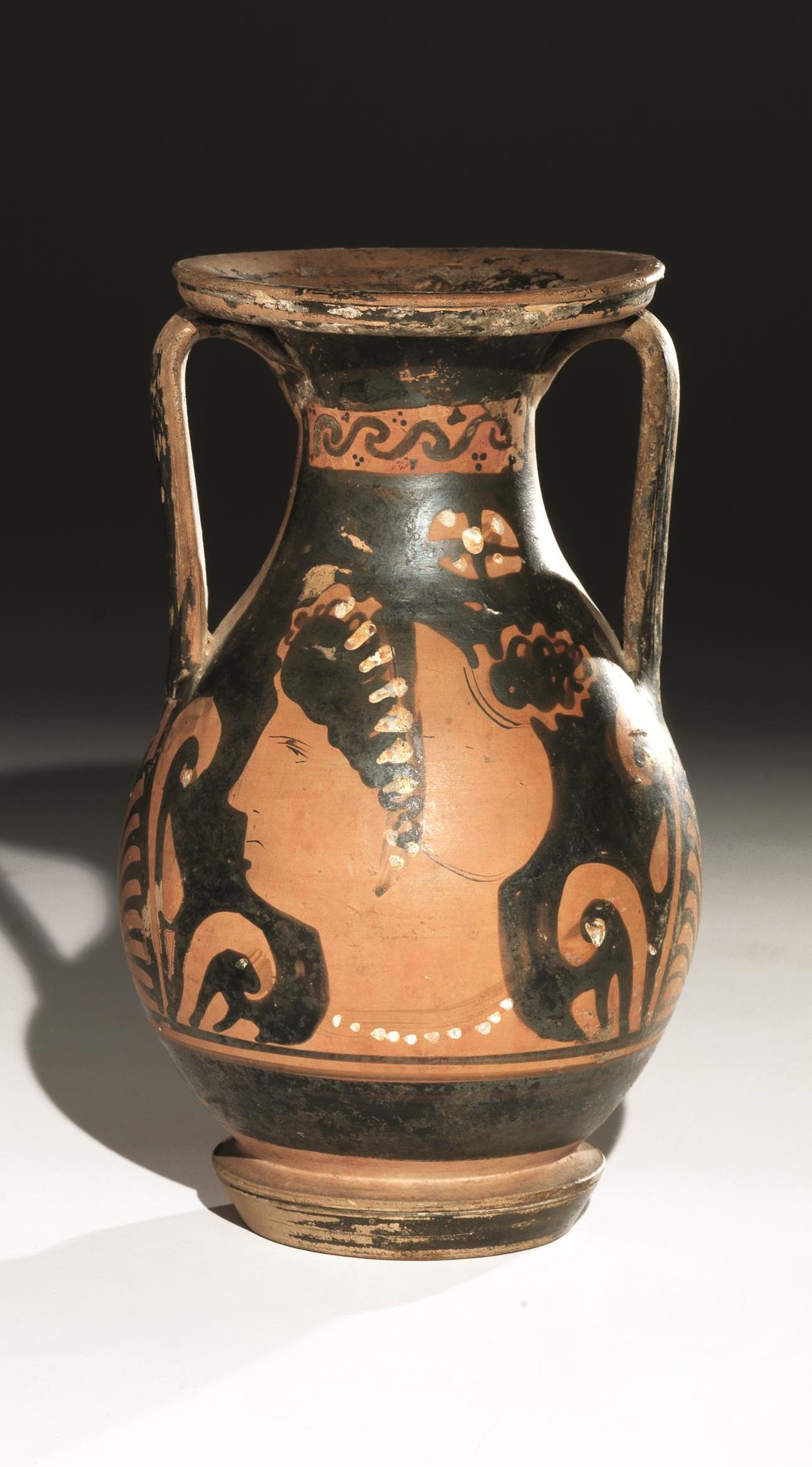 Decorazione accessoria: labbro e linea in fondo al corpo risparmiate; sul collo: lato A: con archetti e punti in nero; lato B: onde ricorrenti tra serie di fogliette e rosette in nero; sotto le anse palmetta aperta fra girali di riempimento