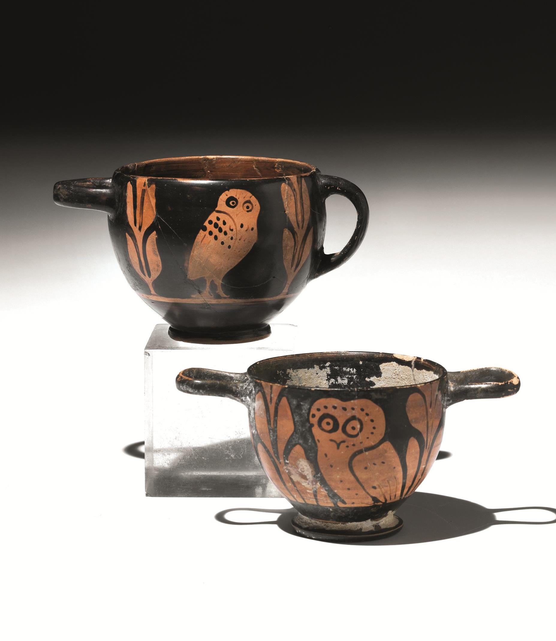 Glaux attica e skyphos apuloMateria e tecnica: argilla figulina beige,...