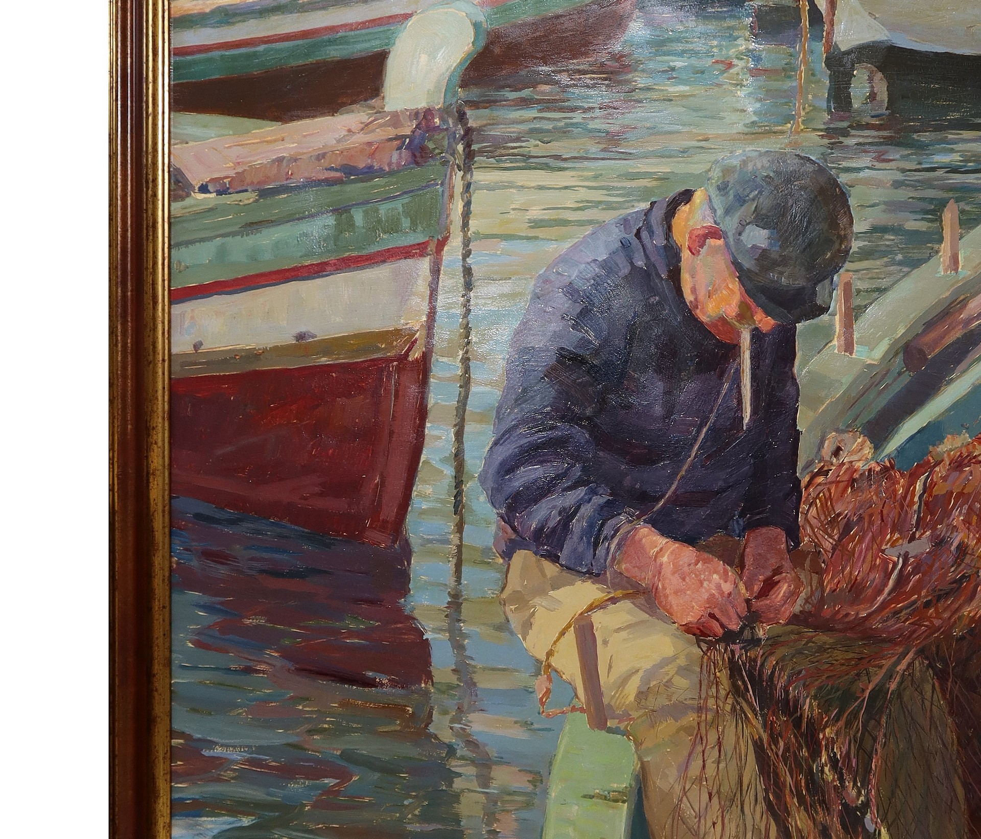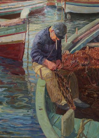 Roberto Rimini (Palermo 1888-1971) - Pescatore ad Acitrezza che rimaglia le reti Cm 100x70, in cornice cm 108x78 Dipinto ad olio su cartone Firmato in basso a sinistra