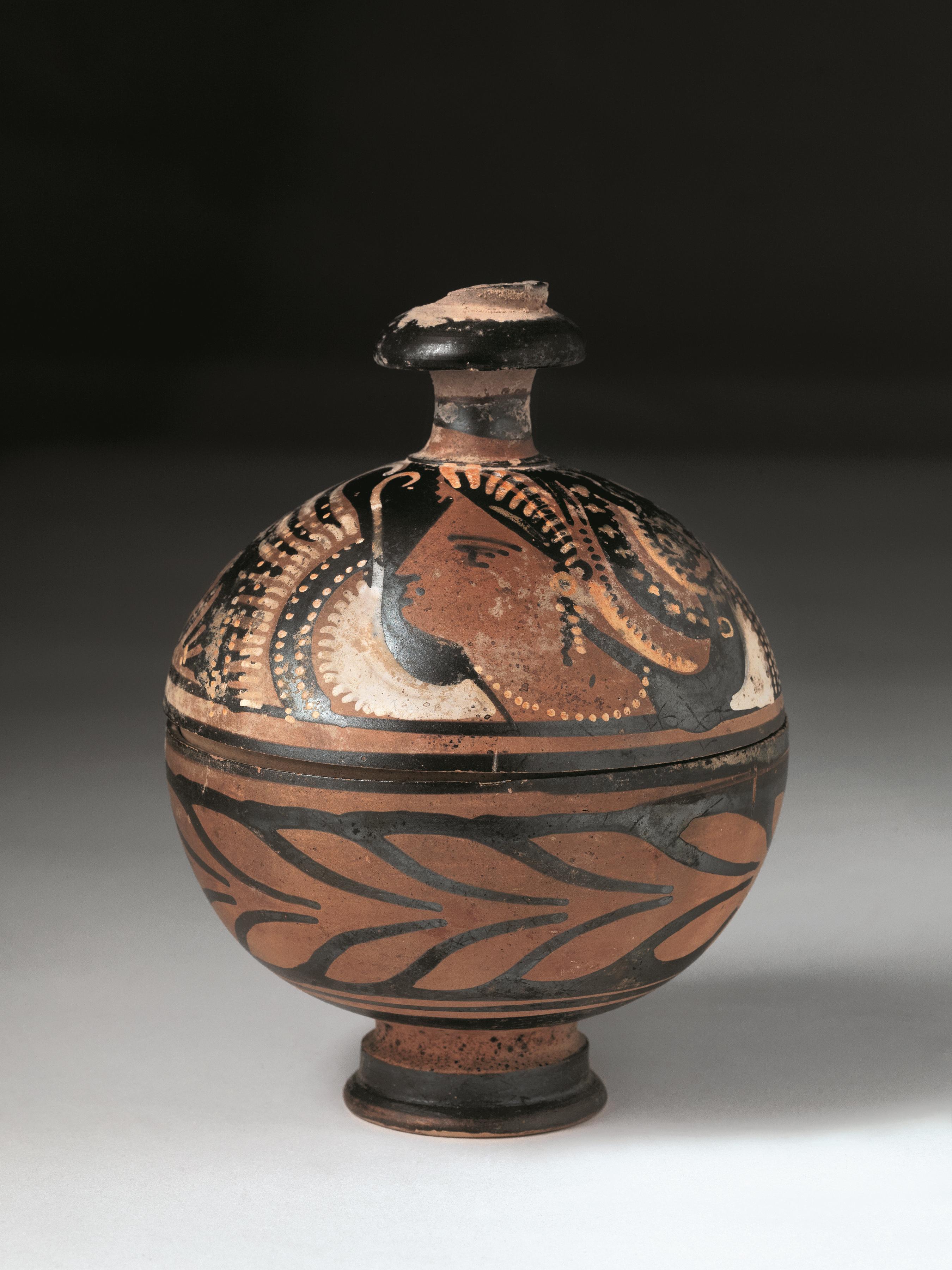 Materia e tecnica: argilla figulina camoscio, vernice nera lucente con riflessi metallici, suddipinture in bianco e giallo, modellata a tornio veloce