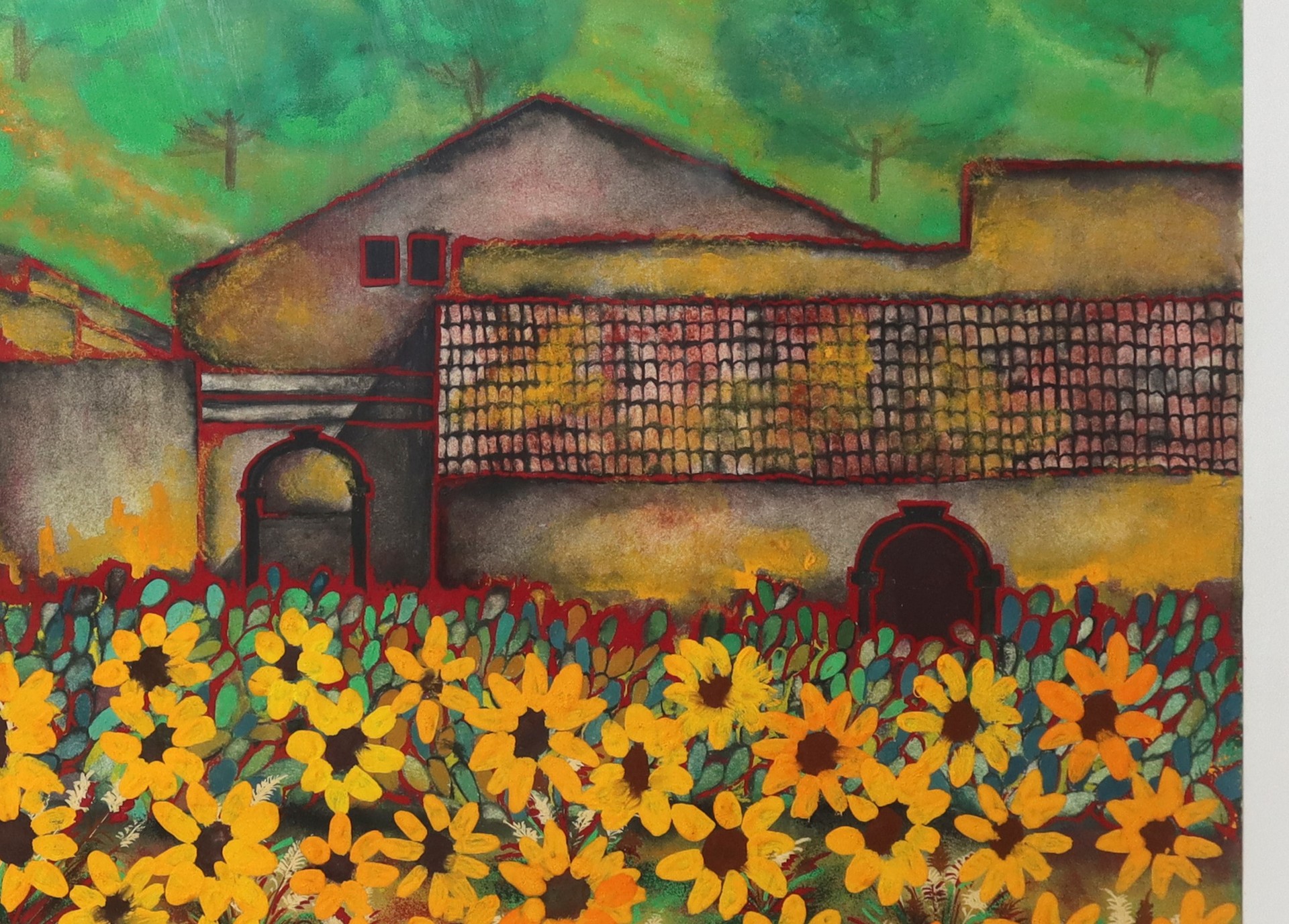 Donatella Maganuco (Catania 1944-2011) - Campo con case e margherite gialle Cm 34x49, in cornice 58x72 Tempera su cartoncino Firmato in vasso a destra e datato 88