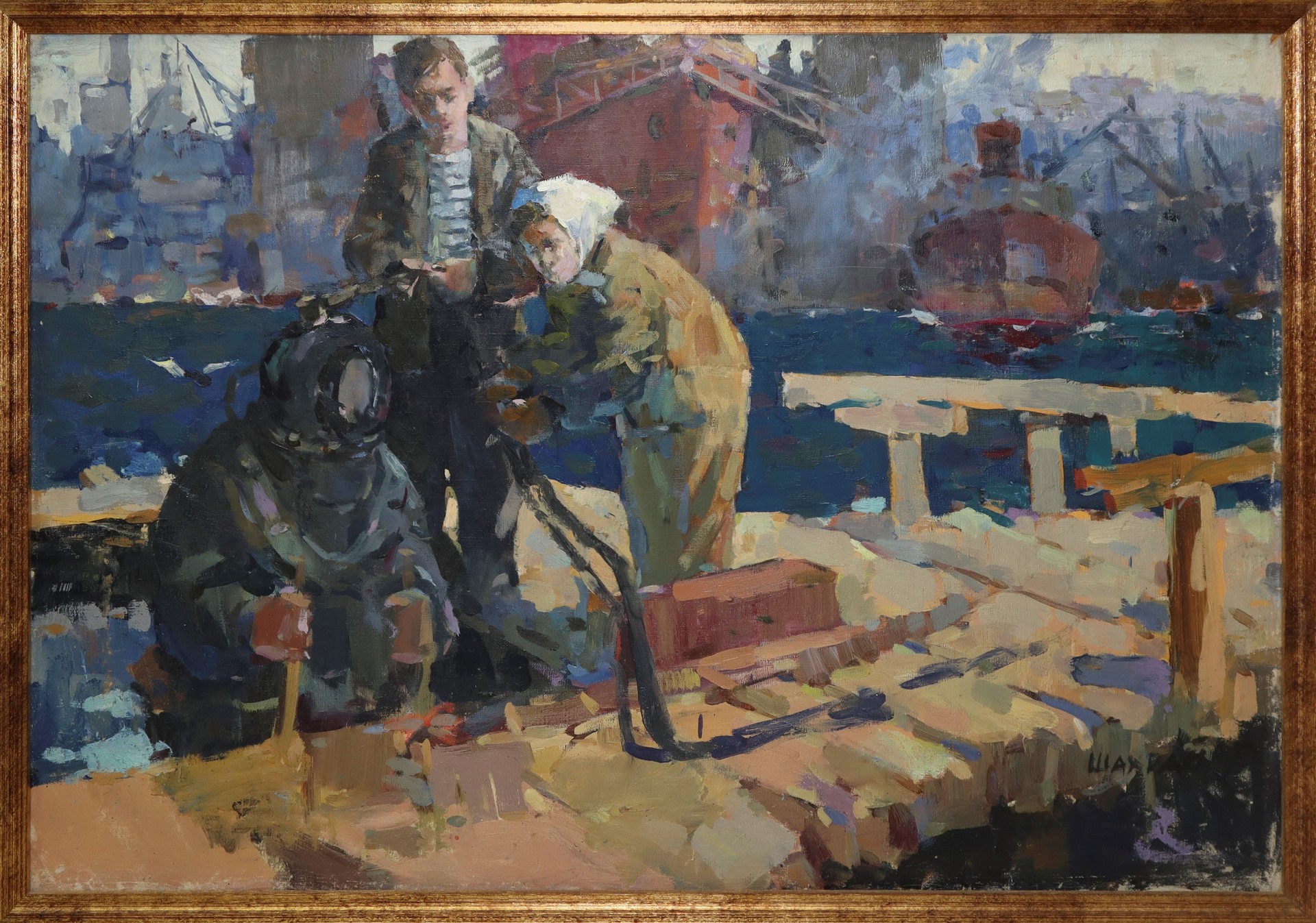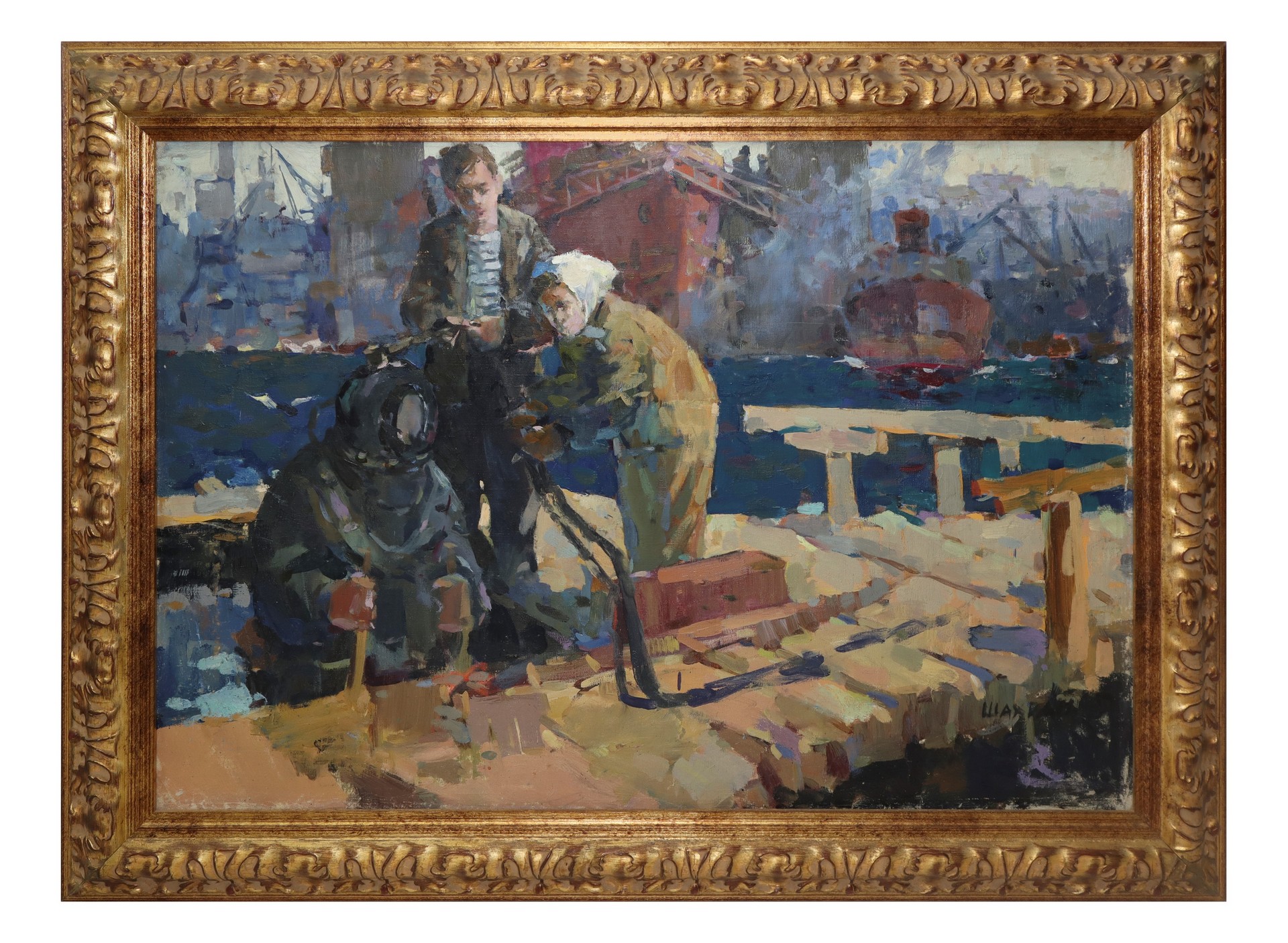 Personaggi con palombaro Cm 60x85, in cornice cm 75x101 Pittore ucraino ShakhraiPittore ucraino Shakhrai