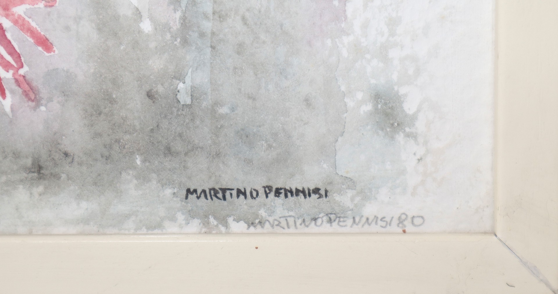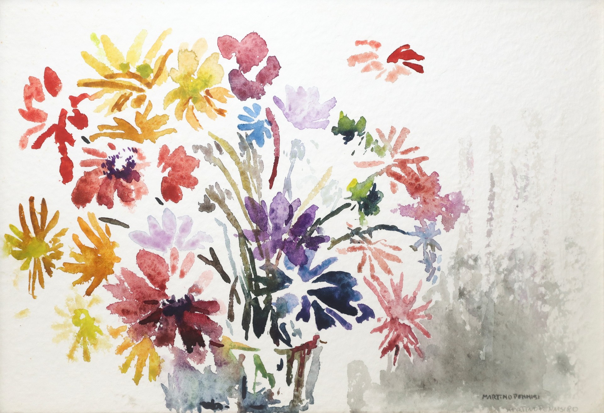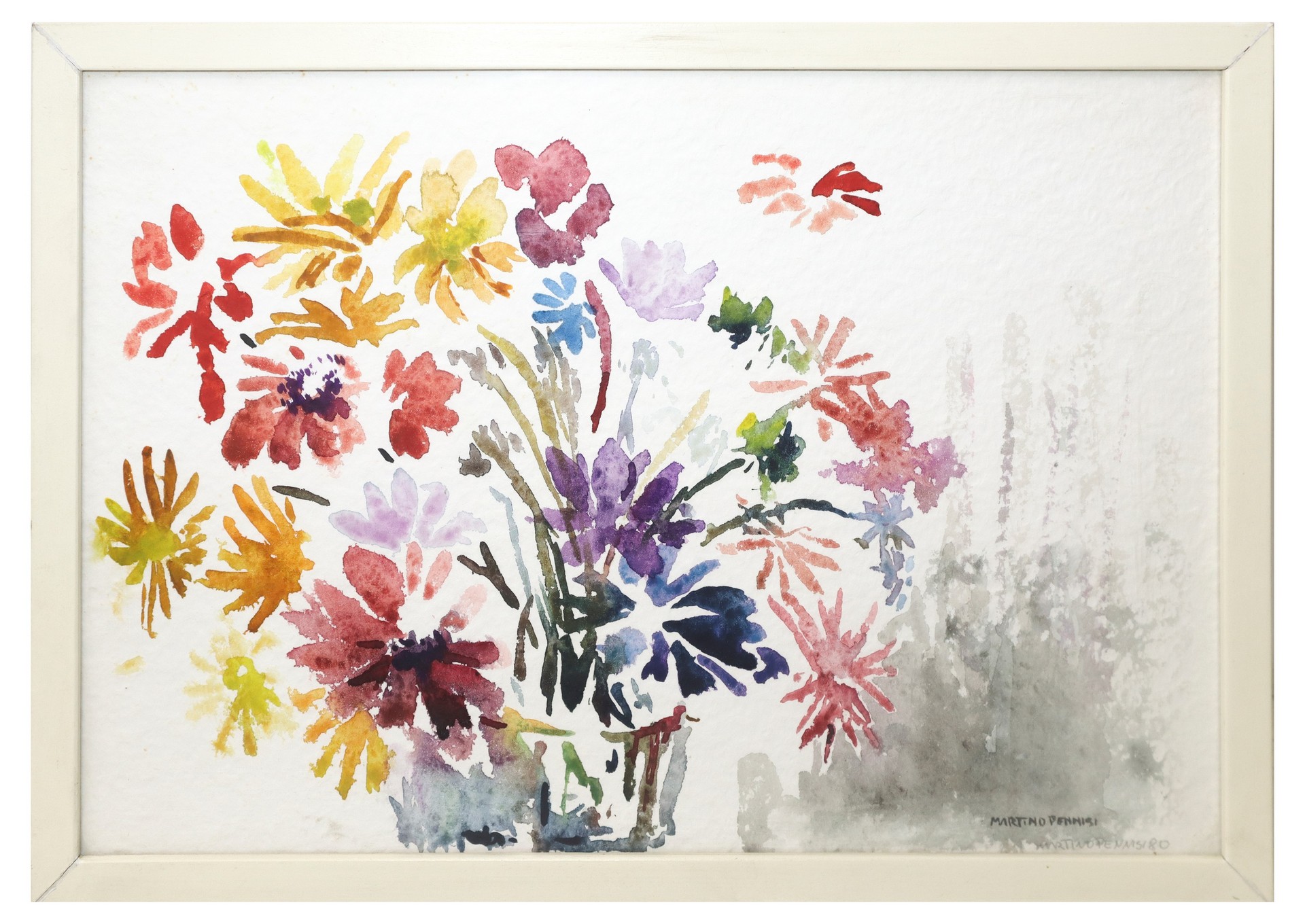 Martino Pennisi (Acireale) - Vaso con fiori Cm 28x39 Acquerello su carta di riso Firmato in basso a destra Martino Pennidi e datato 80, sul retro Etichetta Cavalier Carmelo Bella (Acireale)
