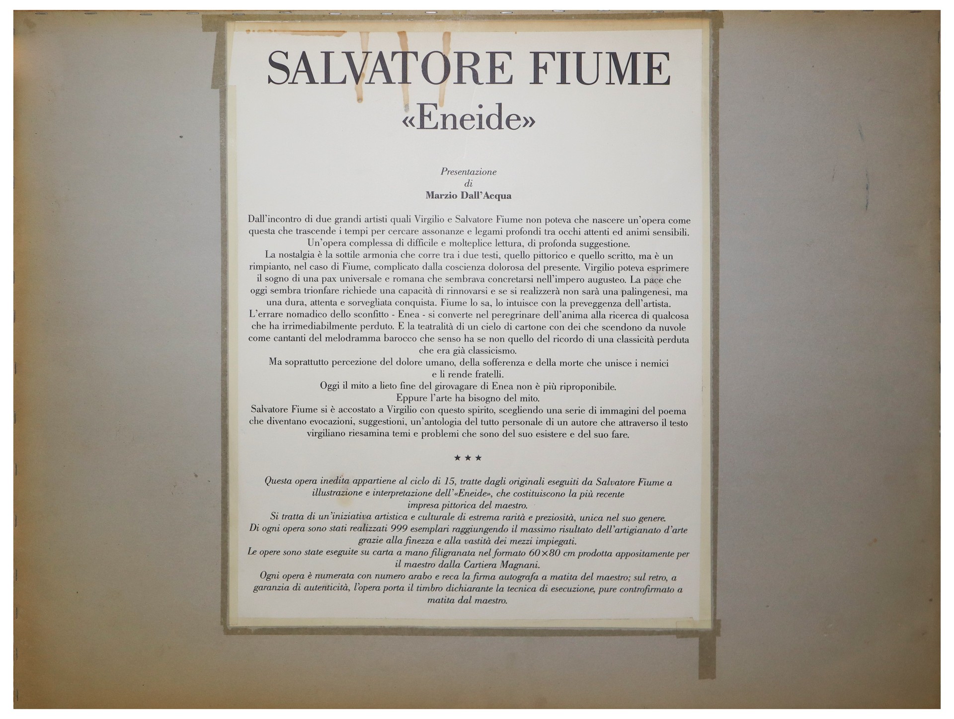 Salvatore Fiume (Comiso 1915-Milano 1997) - Eneide 721/999 cm 60x80 carta filagranata Opera inedita che appartiene al ciclo di 15. Carta filigranata prodotta appositamente per il maestro della Cartiera Magnani. Ogni opera è numerata con numero arabo e reca la firma autografa a matita del maestro; sul retro, a garanzia di autenticità, l'opera porta il timbro dichiarante la tecnica di esecuzione, pure controfirmato a matita del maestro.