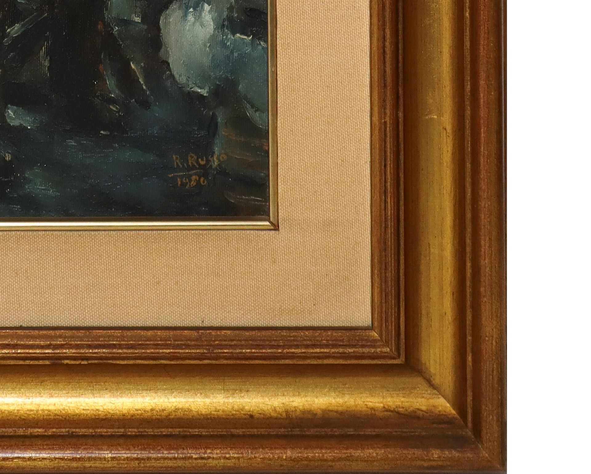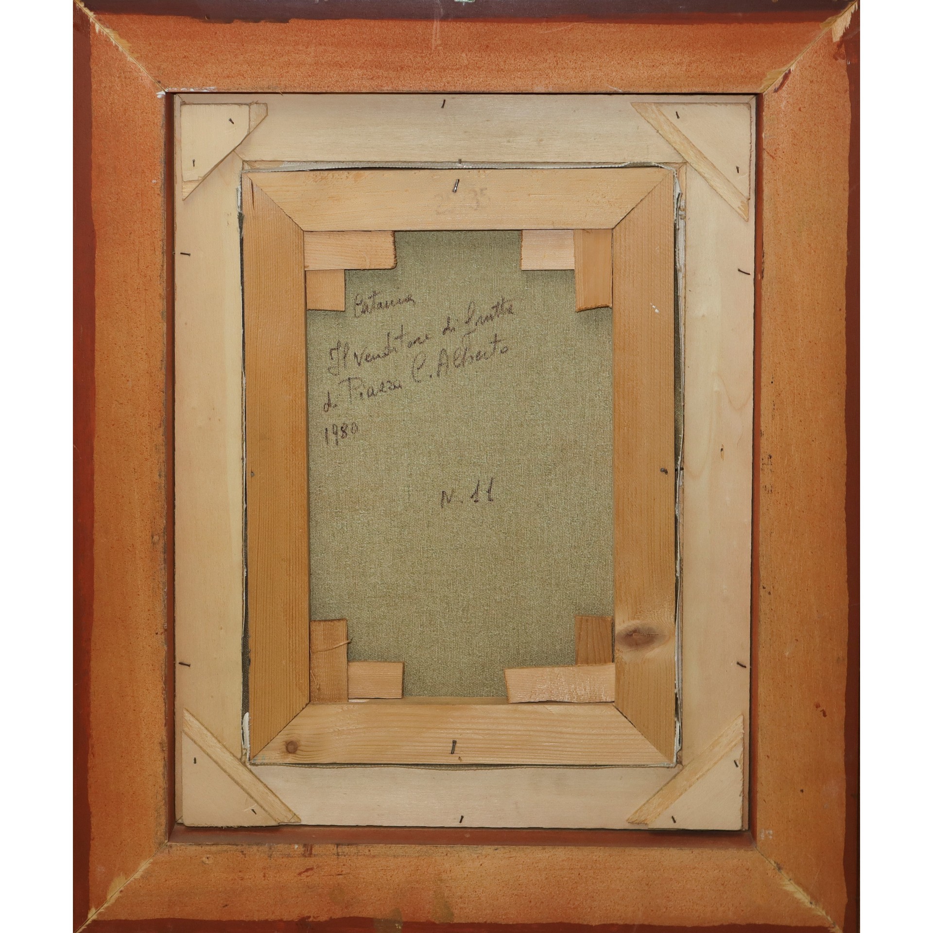 Catania, il venditore di frutta di piazza Carlo Alberto h cm 35 x 25, in cornice 56.5 x 47 Firmato in basso a destra R. Russo 1980.Firmato in basso a destra R. Russo 1980.