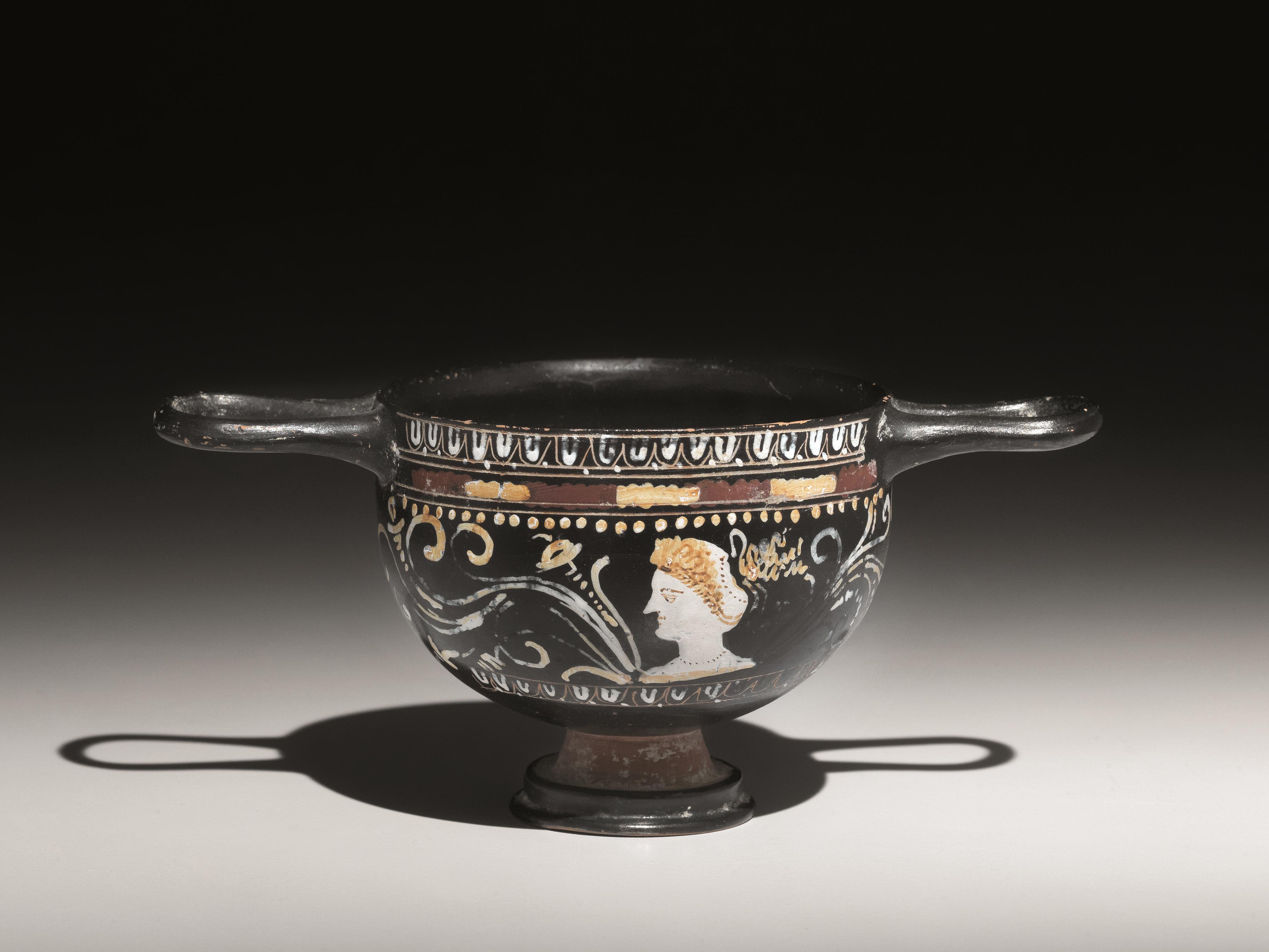 Decorazione: lato A) sotto l’orlo fascia con kyma ionico di ovoli separati da puntini cui fa seguito una banda con motivo a tremolo alternato in paonazzo e giallo, sulla vasca busto femminile in bianco di profilo a destra con stephane radiata, collana di perle. I capelli sono avvolti nel kekryphalos ricamato con motivo a puntini, chiuso da lunghi nastri svolazzanti; il busto è inquadrato da grandi volute vegetali e fiori stilizzati, al di sotto altro kyma ionico; lato B) sotto l’orlo fascia con kyma di ovoli separati da puntini da cui pendono tre tralci di foglie di edera cuoriformi intervallate da rosette a puntini