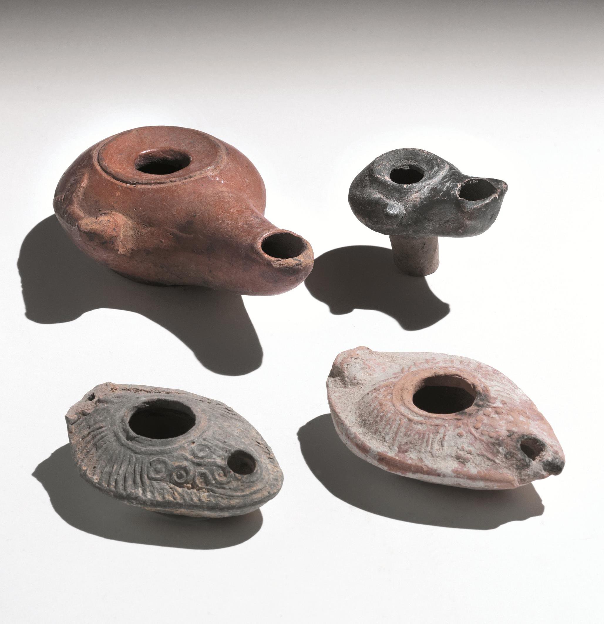 Due lucerne a navicella decorate con strigilature nella parte superiore e motivi fitomorfi stilizzati, una lucerna circolare con becco allungato e presa in forma di pesce, una piccola lucerna a vernice nera con appendice inferiore per il sostegno oggi mancante (4)