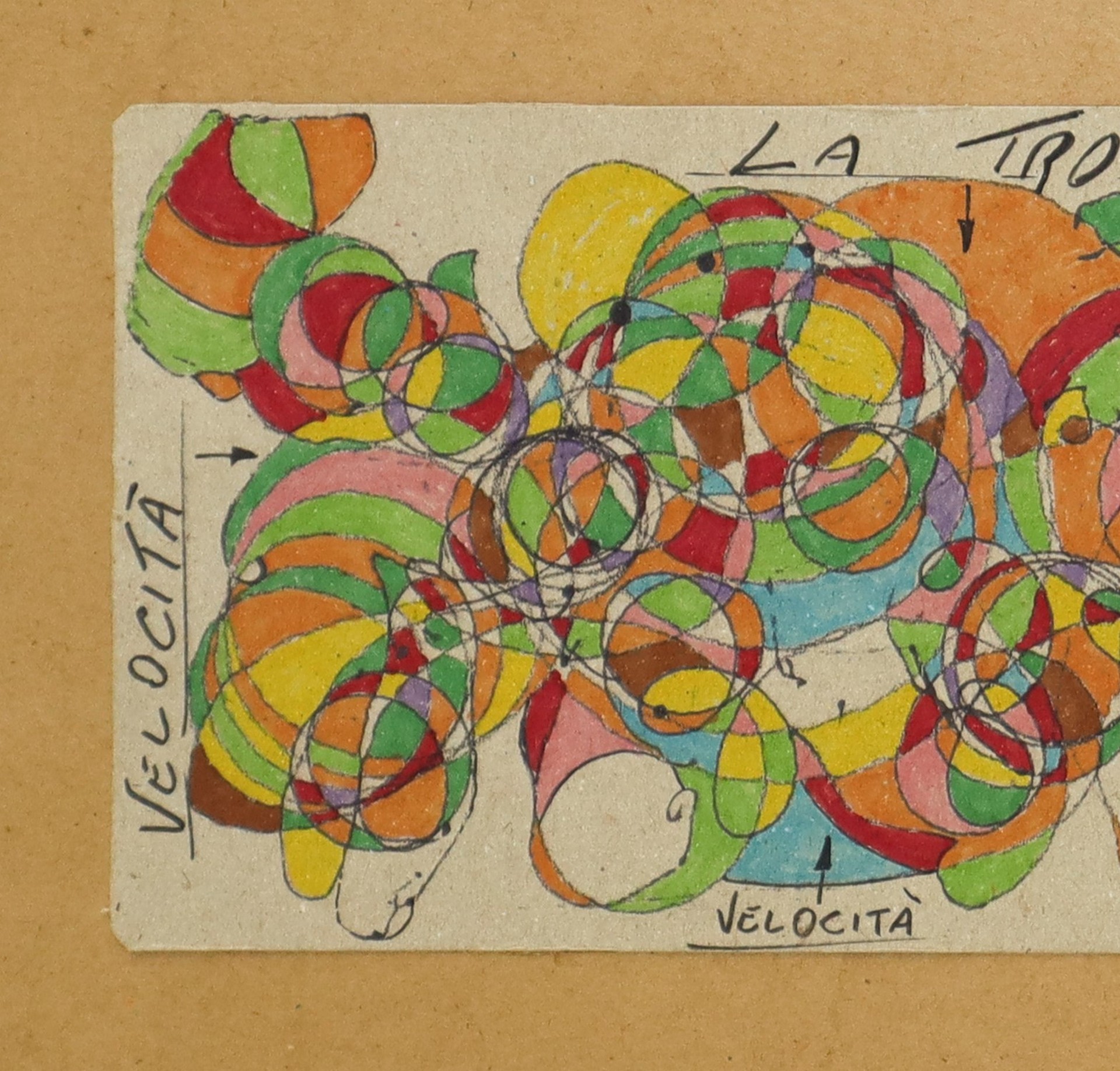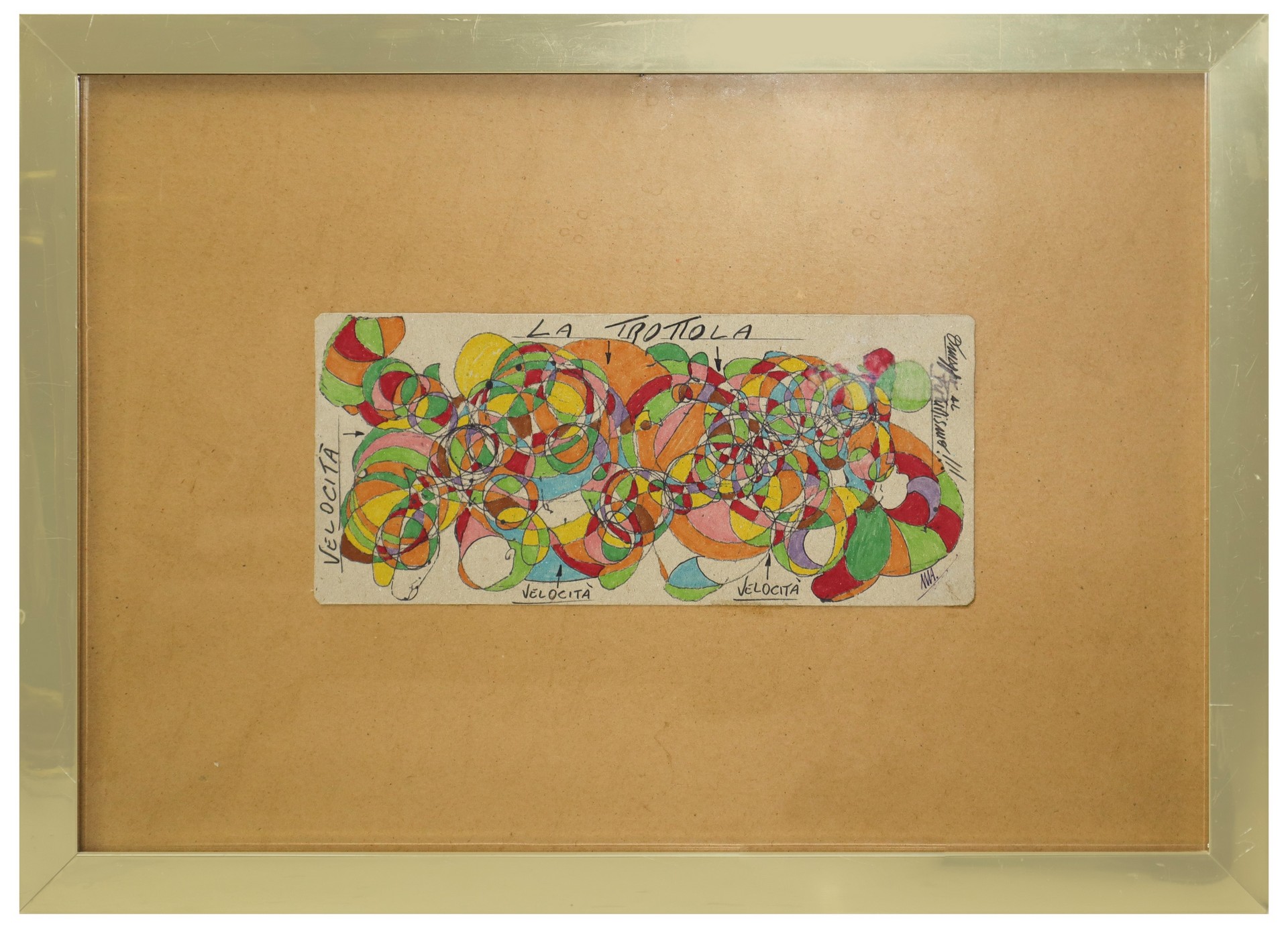 La trottola cm 13x28; in cornice cm 39x54 tempera su cartoncino Omaggio al futurismo. Fimato in basso a destra M.A