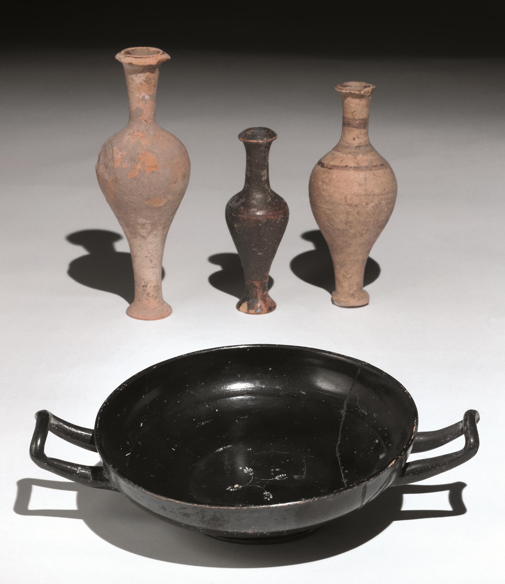 Kylix a vasca troncoconica a profilo arrotondato con risega interna, basso piede troncoconico modanato, anse a bastoncello impostate obliquamente sotto l’orlo e ritorte verso l’alto, fondo verniciato in rosso e tre unguentari fusiformi di cui uno interamente dipinto a vernice nera, uno acromo e uno con fasce in bruno sul collo (4)