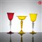 MURANO - Piccola collezione di tre calici nei toni del rosso e del giallo con decorazione a foglia d’oro nel gambo, anni ‘30, altezze cm 24,1; cm 20,3; cm 23.