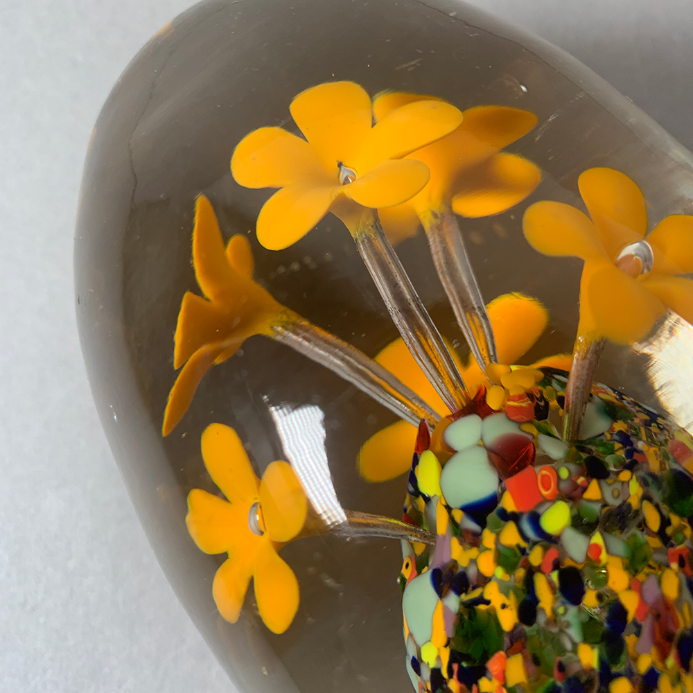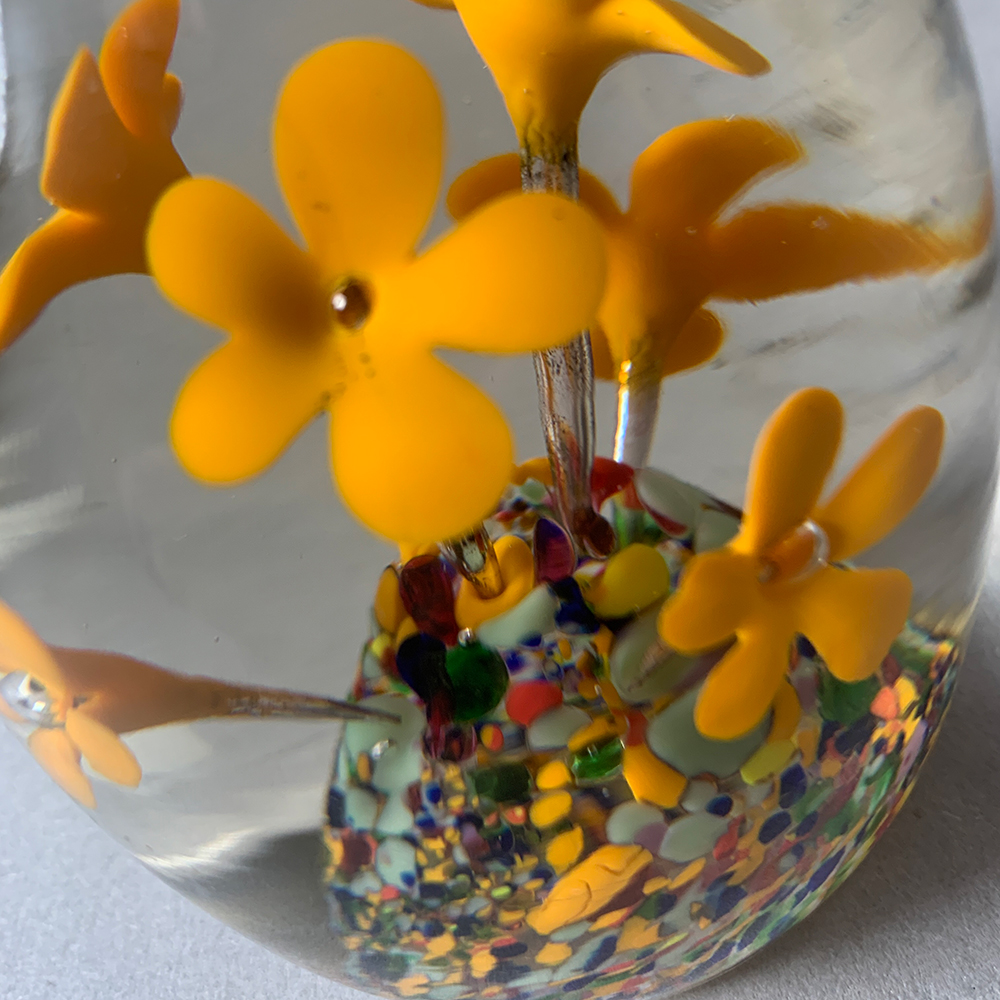 BOEMIA - Piccola collezione di tre fermacarte in vetro trasparente con fiori policromi inclusi all’interno, altezze cm 9,5; cm 10,4; cm 11.