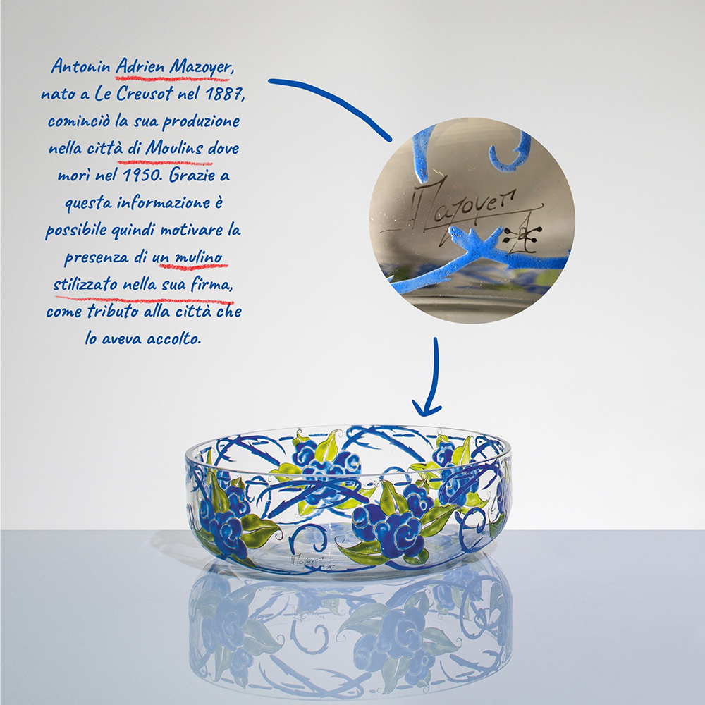 Antonin Adrien Mazoyer, nato a Le Creusot nel 1887, cominciò la sua produzione nella città di Moulins dove morì nel 1950. Grazie a questa informazione è possibile quindi motivare la presenza di un mulino stilizzato nella sua firma, come tributo alla città che lo aveva accolto.