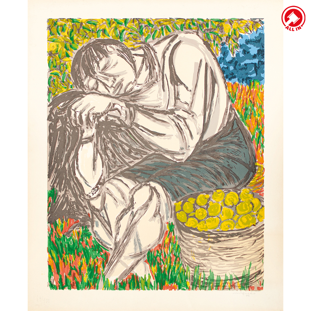 Serigrafia su carta intitolata "Il riposo, 1972", ed. 69/100. Edizione Galleria d’arte “Il Castello”, Milano (timbro al verso con certificato di garanzia), cm 67x57.