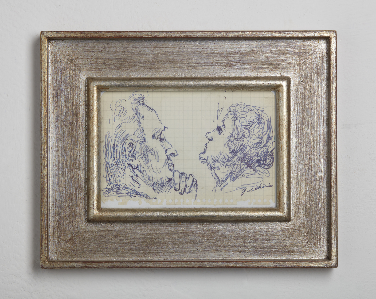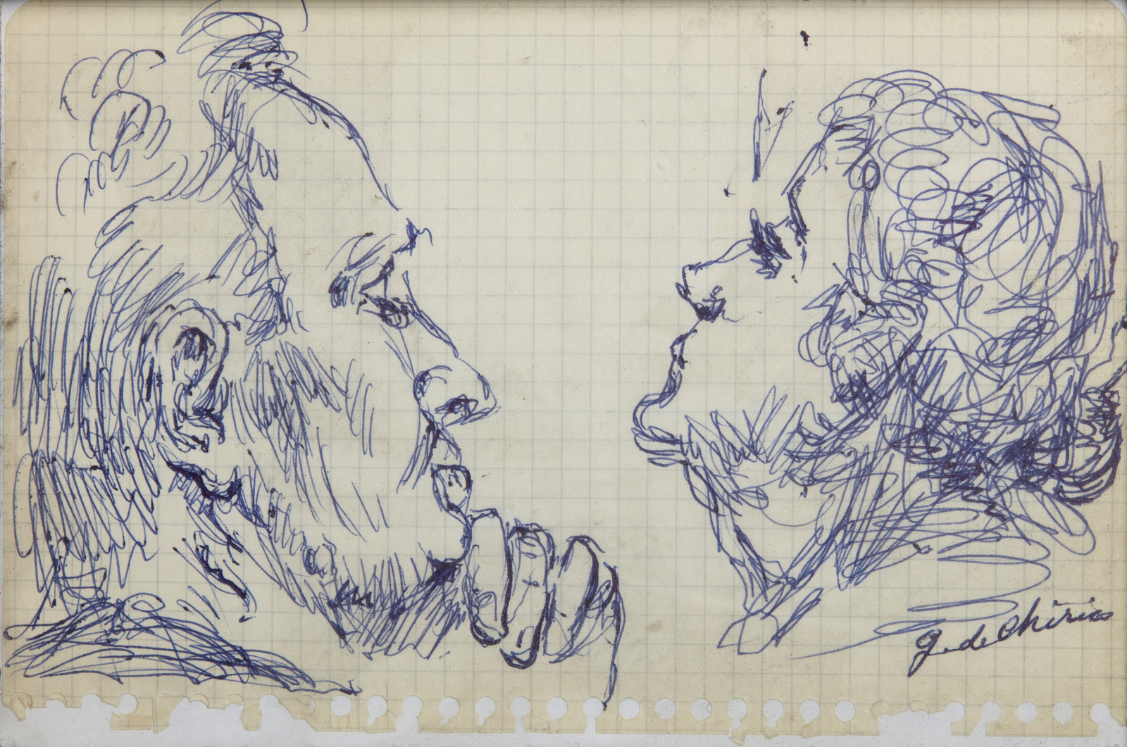 DE CHIRICO GIORGIO (1888 - 1978) Studio di volti maschili di profilo. Biro su carta. Cm 15,60 x 10,20. Firma in basso a destra. Opera archiviata presso la Fondazione Giorgio e Isa De Chirico, Roma, come da documentazione fotografica allegata all'opera riportante il relativo numero d'inventario. Metà anni '60.