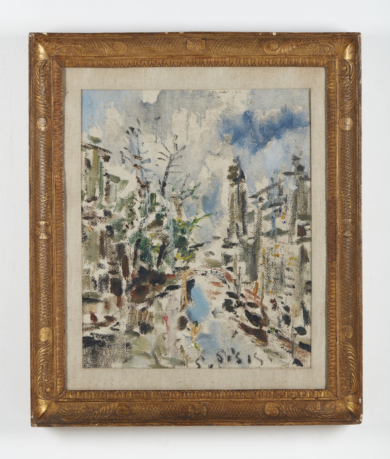 DE PISIS FILIPPO (1896 - 1956) Canale di Venezia. Olio su tela . Cm 53,50 x 63,50. Firma in basso a destra. Al retro cartiglio descrittivo e timbri Galleria d'arte Pinacoteca, Roma. Opera archiviata presso l'Associazione per il Patrocinio delle opere di Filippo De Pisis,Milano, come da documentazione fotografica allegata all'opera riportante il relativo numero d'inventario. Lievi difetti. Cornice presente